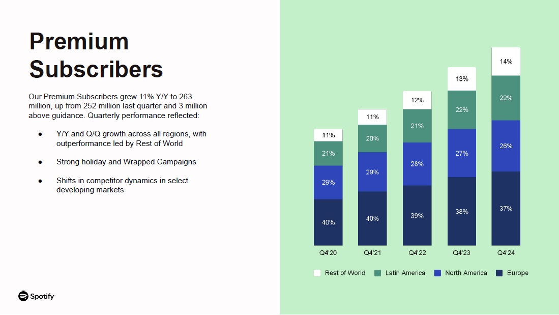 Our Premium Subscribers grew 11% Y/Y to 263 million, up from 252 million last quarter and 3 million above guidance. Quarterly performance reflected:  Y/Y and Q/Q growth across all regions, with outperformance led by Rest of World  Strong holiday and Wrapped Campaigns  Shifts in competitor dynamics in select developing markets  Premium Subscribers