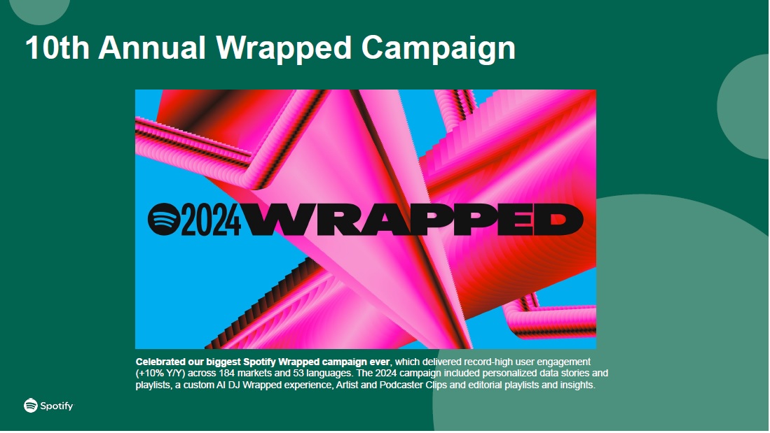 10th Annual Wrapped Campaign  Celebrated our biggest Spotify Wrapped campaign ever, which delivered record-high user engagement (+10% Y/Y) across 184 markets and 53 languages. The 2024 campaign included personalized data stories and playlists, a custom AI DJ Wrapped experience, Artist and Podcaster Clips and editorial playlists and insights.