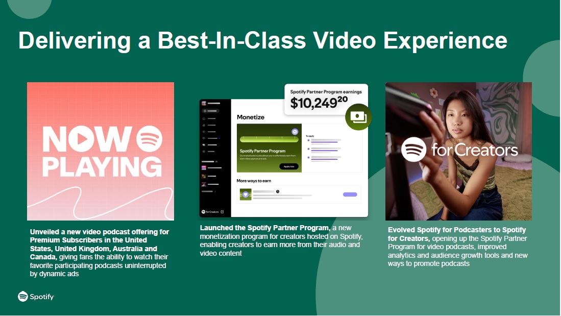 Delivering a Best-In-Class Video Experience  Unveiled a new video podcast offering for Premium Subscribers in the United States, United Kingdom, Australia and Canada, giving fans the ability to watch their favorite participating podcasts uninterrupted by dynamic ads  Evolved Spotify for Podcasters to Spotify for Creators, opening up the Spotify Partner Program for video podcasts, improved analytics and audience growth tools and new ways to promote podcasts  Launched the Spotify Partner Program, a new monetization program for creators hosted on Spotify, enabling creators to earn more from their audio and video content
