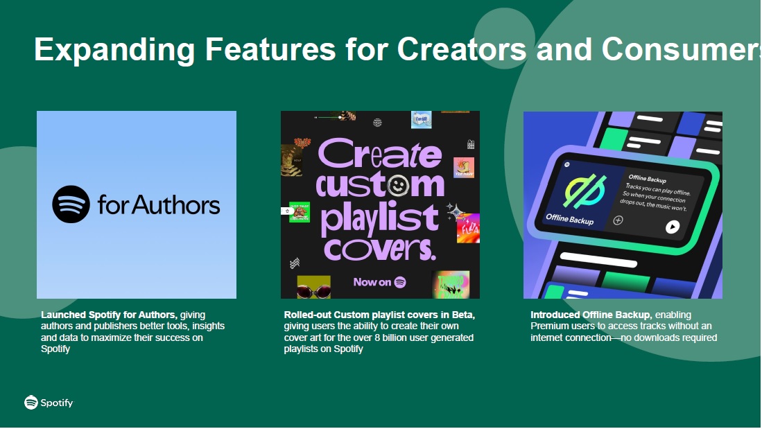 Expanding Features for Creators and Consumer  Rolled-out Custom playlist covers in Beta, giving users the ability to create their own cover art for the over 8 billion user generated playlists on Spotify  Launched Spotify for Authors, giving authors and publishers better tools, insights and data to maximize their success on Spotify  Introduced Offline Backup, enabling Premium users to access tracks without an internet connection—no downloads required