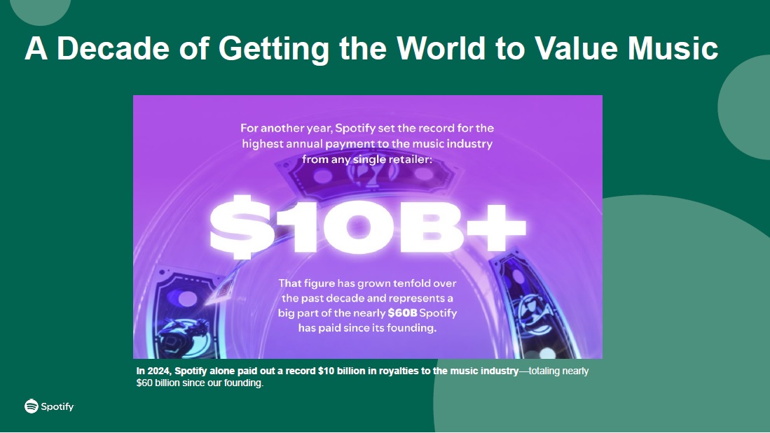 A Decade of Getting the World to Value Music  In 2024, Spotify alone paid out a record $10 billion in royalties to the music industry—totaling nearly  $60 billion since our founding.
