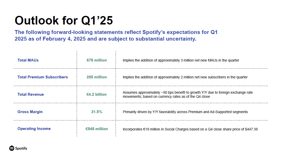Outlook for Q1’25  The following forward-looking statements reflect Spotify’s expectations for Q1 2025 as of February 4, 2025 and are subject to substantial uncertainty.  Total MAUs  678 million  Implies the addition of approximately 3 million net new MAUs in the quarter  Total Premium Subscribers  265 million  Implies the addition of approximately 2 million net new subscribers in the quarter  Total Revenue  €4.2 billion  Assumes approximately ~90 bps benefit to growth Y/Y due to foreign exchange rate movements; based on currency rates as of the Q4 close  Gross Margin  31.5%  Primarily driven by Y/Y favorability across Premium and Ad-Supported segments  Operating Income  €548 million  Incorporates €18 million in Social Charges based on a Q4 close share price of $447.38