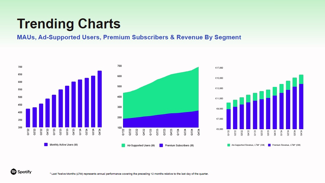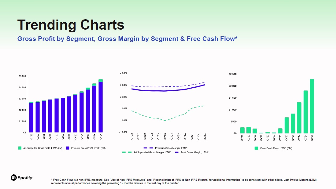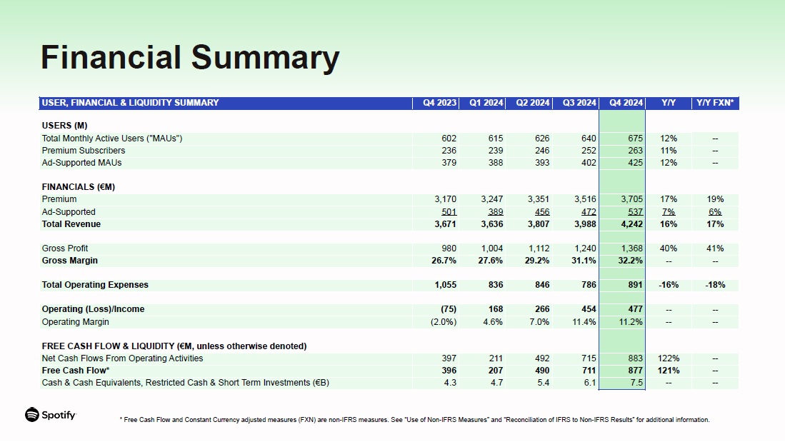 USER, FINANCIAL & LIQUIDITY SUMMARY  Q4 2023  Q1 2024  Q2 2024  Q3 2024 Q4 2024 Y/Y  Y/Y FXN*  USERS (M)  Total Monthly Active Users ("MAUs")  602  615  626  640  675  12%  --  Premium Subscribers  236  239  246  252  263  11%  --  Ad-Supported MAUs  379  388  393  402  425  12%  --  FINANCIALS (€M)  Premium  3,170  3,247  3,351  3,516  3,705  17%  19%  Ad-Supported  501  389  456  472  537  7%  6%  Total Revenue  3,671  3,636  3,807  3,988  4,242  16%  17%  Gross Profit  980  1,004  1,112  1,240  1,368  40%  41%  Gross Margin  26.7%  27.6%  29.2%  31.1%  32.2%  --  --  Total Operating Expenses  1,055  836  846  786  891  -16%  -18%  Operating (Loss)/Income  (75)  168  266  454  477  --  --  Operating Margin  (2.0%)  4.6%  7.0%  11.4%  11.2%  --  --  FREE CASH FLOW & LIQUIDITY (€M, unless otherwise denoted)  Net Cash Flows From Operating Activities  397  211  492  715  883  122%  --  Free Cash Flow*  396  207  490  711  877  121%  --  Cash & Cash Equivalents, Restricted Cash & Short Term Investments (€B)  4.3  4.7  5.4  6.1  7.5  --  --  Financial Summary  * Free Cash Flow and Constant Currency adjusted measures (FXN) are non-IFRS measures. See “Use of Non-IFRS Measures” and “Reconciliation of IFRS to Non-IFRS Results” for additional information.