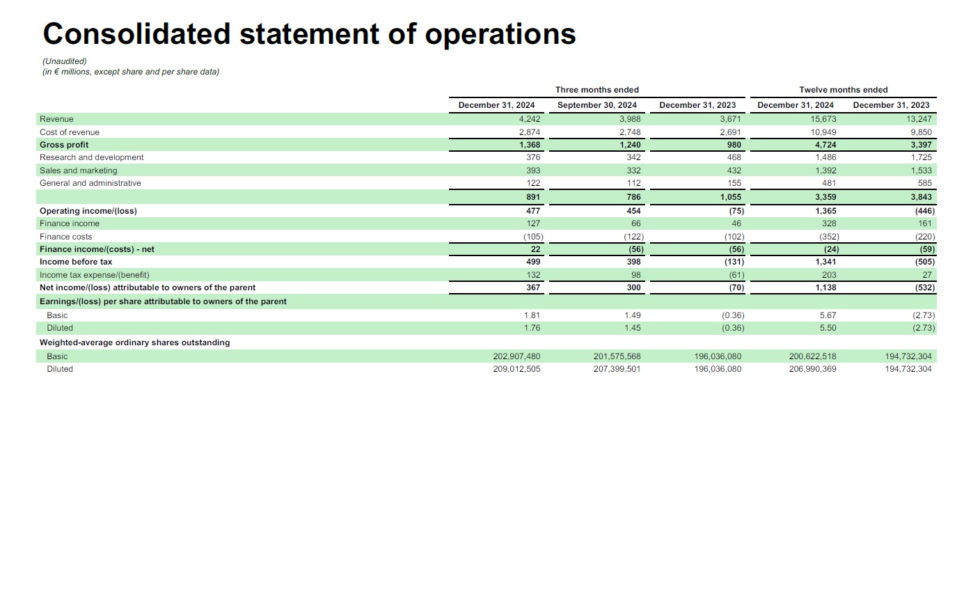 Consolidated statement of operations  (Unaudited)  (in € millions, except share and per share data)  December 31, 2024  September 30, 2024  December 31, 2023  December 31, 2024  December 31, 2023  Revenue  4,242  3,988  3,671  15,673  13,247  Cost of revenue  2,874  2,748  2,691  10,949  9,850  Gross profit  1,368  1,240  980  4,724  3,397  Research and development  376  342  468  1,486  1,725  Sales and marketing  393  332  432  1,392  1,533  General and administrative  122  112  155  481  585  891  786  1,055  3,359  3,843  Operating income/(loss)  477  454  (75)  1,365  (446)  Finance income  127  66  46  328  161  Finance costs  (105)  (122)  (102)  (352)  (220)  Finance income/(costs) - net  22  (56)  (56)  (24)  (59)  Income before tax  499  398  (131)  1,341  (505)  Income tax expense/(benefit)  132  98  (61)  203  27  Net income/(loss) attributable to owners of the parent  367  300  (70)  1,138  (532)  Earnings/(loss) per share attributable to owners of the parent  Basic  1.81  1.49  (0.36)  5.67  (2.73)  Diluted 1.76  1.45  (0.36)  5.50  (2.73)  Basic 202,907,480  201,575,568  196,036,080  200,622,518  194,732,304  Three months ended  Twelve months ended  Weighted-average ordinary shares outstanding  Diluted  209,012,505  207,399,501  196,036,080  206,990,369  194,732,304