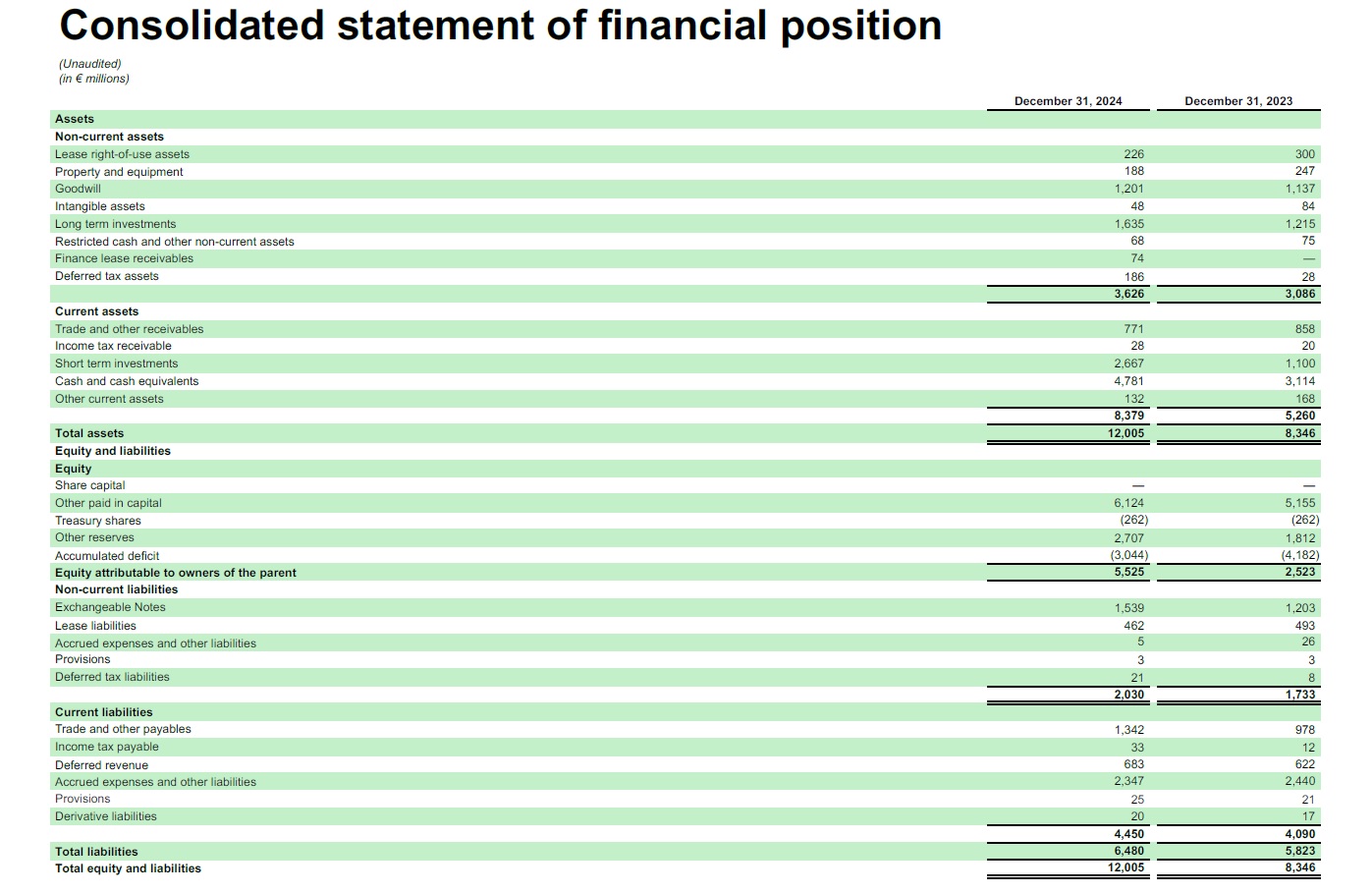 (Unaudited)  (in € millions)  December 31, 2024  December 31, 2023  Assets  Non-current assets  Lease right-of-use assets  226  300  Property and equipment  188  247  Goodwill  1,201  1,137  Intangible assets  48  84  Long term investments  1,635  1,215  Restricted cash and other non-current assets  68  75  Finance lease receivables  74  —  Deferred tax assets  186  28  3,626  3,086  Current assets  Trade and other receivables  771  858  Income tax receivable  28  20  Short term investments  2,667  1,100  Cash and cash equivalents  4,781  3,114  Other current assets  132  168  8,379  5,260  Total assets   12,005  8,346  Equity and liabilities  Equity  Share capital  —  —  Other paid in capital  6,124  5,155  Treasury shares  (262)  (262)  Other reserves  2,707  1,812  Accumulated deficit  (3,044)  (4,182)  Equity attributable to owners of the parent  5,525  2,523  Non-current liabilities  Exchangeable Notes  1,539  1,203  Lease liabilities  462  493  Accrued expenses and other liabilities  5  26  Provisions  3  3  Deferred tax liabilities  21  8   2,030  1,733  Current liabilities  Trade and other payables  1,342  978  Income tax payable  33  12  Deferred revenue  683  622  Accrued expenses and other liabilities  2,347  2,440  Provisions  25  21  Derivative liabilities  20  17  4,450  4,090  Total liabilities  6,480  5,823  Total equity and liabilities   12,005  8,346  Consolidated statement of financial position