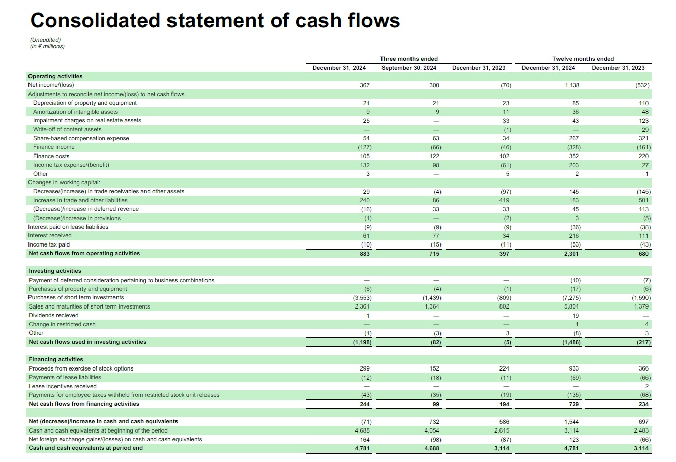 Twelve months ended  December 31, 2024  September 30, 2024  December 31, 2023  December 31, 2024  December 31, 2023  Operating activities  Net income/(loss)  367  300  (70)  1,138  (532)  Adjustments to reconcile net income/(loss) to net cash flows  Depreciation of property and equipment  21  21  23  85  110  Amortization of intangible assets  9  9  11  36  48  Impairment charges on real estate assets  25  —  33  43  123  Write-off of content assets  —  —  (1)  —  29  Share-based compensation expense  54  63  34  267  321  Finance income  (127)  (66)  (46)  (328)  (161)  Finance costs  105  122  102  352  220  Income tax expense/(benefit)  132  98  (61)  203  27  Other  3  —  5  2  1  Changes in working capital:  Decrease/(increase) in trade receivables and other assets  29  (4)  (97)  145  (145)  Increase in trade and other liabilities  240  86  419  183  501  (Decrease)/increase in deferred revenue  (16)  33  33  45  113  (Decrease)/increase in provisions  (1)  —  (2)  3  (5)  Interest paid on lease liabilities  (9)  (9)  (9)  (36)  (38)  Interest received  61  77  34  216  111  Income tax paid  (10)  (15)  (11)  (53)  (43)  Net cash flows from operating activities  883  715  397  2,301  680  Investing activities  Payment of deferred consideration pertaining to business combinations  —  —  —  (10)  (7)  Purchases of property and equipment  (6)  (4)  (1)  (17)  (6)  Purchases of short term investments  (3,553)  (1,439)  (809)  (7,275)  (1,590)  Sales and maturities of short term investments  2,361  1,364  802  5,804  1,379  Dividends recieved  1  —  —  19  —  Change in restricted cash  —  —  —  1  4  Other  (1)  (3)  3  (8)  3  Net cash flows used in investing activities  (1,198)  (82)  (5)  (1,486)  (217)  Financing activities  Proceeds from exercise of stock options  299  152  224  933  366  Payments of lease liabilities  (12)  (18)  (11)  (69)  (66)  Lease incentives received  —  —  —  —  2  Payments for employee taxes withheld from restricted stock unit releases  (43)  (35)  (19)  (135)  (68)  Net cash flows from financing activities  244  99  194  729  234  Net (decrease)/increase in cash and cash equivalents  (71)  732  586  1,544  697  Cash and cash equivalents at beginning of the period  4,688  4,054  2,615  3,114  2,483  Net foreign exchange gains/(losses) on cash and cash equivalents  164  (98)  (87)  123  (66)  Cash and cash equivalents at period end   4,781   4,688 3,114 4,781  3,114  (Unaudited) (in € millions)  Three months ended  Consolidated statement of cash flows