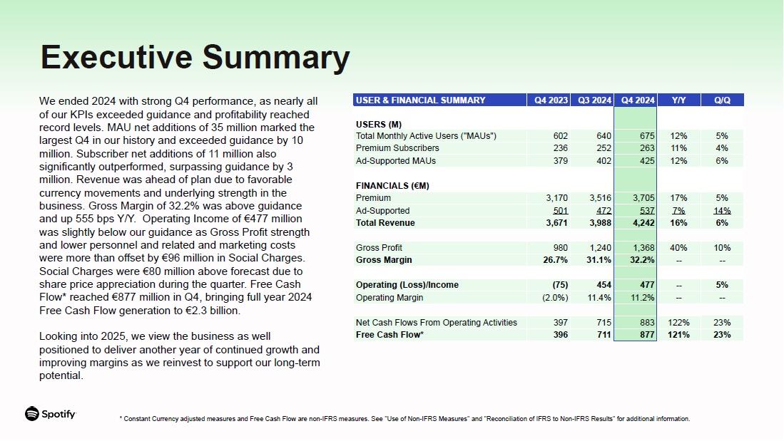 Executive Summary  USER & FINANCIAL SUMMARY  Q4 2023  Q3 2024  Q4 2024  Y/Y  Q/Q  USERS (M)  Total Monthly Active Users ("MAUs")  602  640  675  12%  5%  Premium Subscribers  236  252  263  11%  4%  Ad-Supported MAUs  379  402  425  12%  6%  FINANCIALS (€M)  Premium  3,170  3,516  3,705  17%  5%  Ad-Supported  501  472  537  7%  14%  Total Revenue  3,671  3,988  4,242  16%  6%  Gross Profit  980  1,240  1,368  40%  10%  Gross Margin  26.7%  31.1%  32.2%  --  --  Operating (Loss)/Income  (75)  454  477  --  5%  Operating Margin  (2.0%)  11.4%  11.2%  --  --  Net Cash Flows From Operating Activities  397  715  883  122%  23%  Free Cash Flow*  396  711  877  121%  23%  * Constant Currency adjusted measures and Free Cash Flow are non-IFRS measures. See "Use of Non-IFRS Measures" and "Reconciliation of IFRS to Non-IFRS Results" for additional information.  We ended 2024 with strong Q4 performance, as nearly all of our KPIs exceeded guidance and profitability reached record levels. MAU net additions of 35 million marked the largest Q4 in our history and exceeded guidance by 10 million. Subscriber net additions of 11 million also significantly outperformed, surpassing guidance by 3 million. Revenue was ahead of plan due to favorable currency movements and underlying strength in the business. Gross Margin of 32.2% was above guidance and up 555 bps Y/Y. Operating Income of €477 million was slightly below our guidance as Gross Profit strength and lower personnel and related and marketing costs were more than offset by €96 million in Social Charges.  Social Charges were €80 million above forecast due to share price appreciation during the quarter. Free Cash Flow* reached €877 million in Q4, bringing full year 2024 Free Cash Flow generation to €2.3 billion.  Looking into 2025, we view the business as well positioned to deliver another year of continued growth and improving margins as we reinvest to support our long-term potential.
