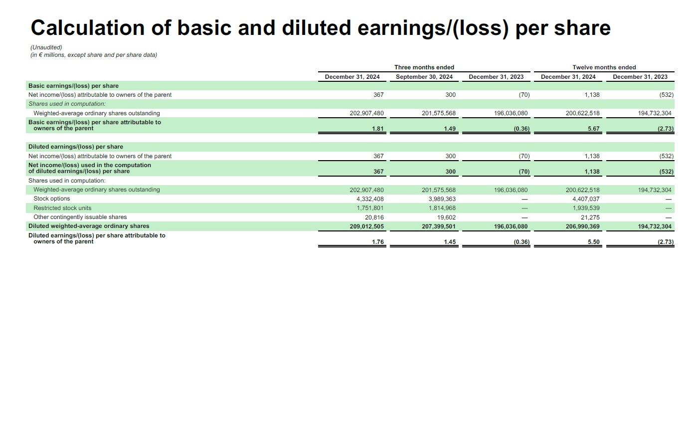 Basic earnings/(loss) per share  Net income/(loss) attributable to owners of the parent 367  300  (70)  1,138  (532)  Shares used in computation:  Weighted-average ordinary shares outstanding 202,907,480  201,575,568  196,036,080  200,622,518  194,732,304  Basic earnings/(loss) per share attributable to owners of the parent   1.81   1.49   (0.36) 5.67   (2.73)  Diluted earnings/(loss) per share  Net income/(loss) attributable to owners of the parent  367  300  (70)  1,138  (532)  Net income/(loss) used in the computation of diluted earnings/(loss) per share  367  300  (70)  1,138  (532)  Shares used in computation:  Weighted-average ordinary shares outstanding  202,907,480  201,575,568  196,036,080  200,622,518  194,732,304  Stock options  4,332,408  3,989,363  —  4,407,037  —  Restricted stock units  1,751,801  1,814,968  —  1,939,539  —  Other contingently issuable shares  20,816  19,602  —  21,275  —  Diluted weighted-average ordinary shares  209,012,505  207,399,501  196,036,080  206,990,369  194,732,304  Diluted earnings/(loss) per share attributable to owners of the parent   1.76   1.45   (0.36)   5.50  (2.73)  (Unaudited)  (in € millions, except share and per share data)  Three months ended Twelve months ended  December 31, 2024 September 30, 2024 December 31, 2023 December 31, 2024 December 31, 2023  Calculation of basic and diluted earnings/(loss) per share