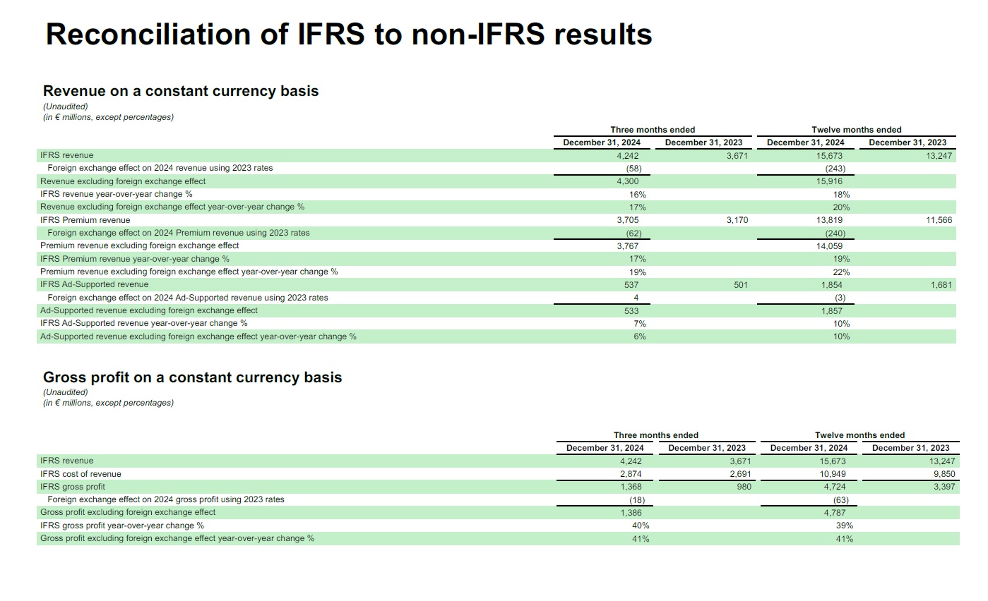 Three months ended  Twelve months ended  December 31, 2024  December 31, 2023  December 31, 2024  December 31, 2023  IFRS revenue  4,242  3,671  15,673  13,247  Foreign exchange effect on 2024 revenue using 2023 rates  (58)  (243)  Revenue excluding foreign exchange effect  4,300  15,916  IFRS revenue year-over-year change %  16%  18%  Revenue excluding foreign exchange effect year-over-year change %  17%  20%  IFRS Premium revenue  3,705  3,170  13,819  11,566  Foreign exchange effect on 2024 Premium revenue using 2023 rates  (62)  (240)  Premium revenue excluding foreign exchange effect  3,767  14,059  IFRS Premium revenue year-over-year change %  17%  19%  Premium revenue excluding foreign exchange effect year-over-year change %  19%  22%  IFRS Ad-Supported revenue  537  501  1,854  1,681  Foreign exchange effect on 2024 Ad-Supported revenue using 2023 rates  4  (3)  Ad-Supported revenue excluding foreign exchange effect  533  1,857  IFRS Ad-Supported revenue year-over-year change %  7%  10%  Ad-Supported revenue excluding foreign exchange effect year-over-year change %  6%  10%  Revenue on a constant currency basis  (Unaudited)  (in € millions, except percentages)  Reconciliation of IFRS to non-IFRS results  Gross profit on a constant currency basis  (Unaudited)  (in € millions, except percentages)  Three months ended  Twelve months ended  December 31, 2024  December 31, 2023  December 31, 2024  December 31, 2023  IFRS revenue  4,242  3,671  15,673  13,247  IFRS cost of revenue  2,874  2,691  10,949  9,850  IFRS gross profit  1,368  980  4,724  3,397  Foreign exchange effect on 2024 gross profit using 2023 rates  (18)  (63)  Gross profit excluding foreign exchange effect  1,386  4,787  IFRS gross profit year-over-year change %  40%  39%  Gross profit excluding foreign exchange effect year-over-year change %  41%  41%
