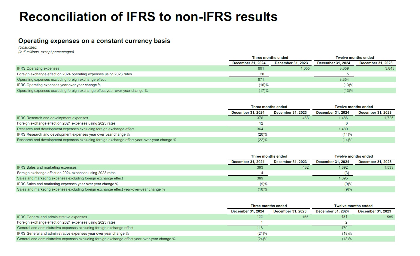 Operating expenses on a constant currency basis  (Unaudited)  (in € millions, except percentages)  Three months ended  December 31, 2024 December 31, 2023  Twelve months ended December 31, 2024 December 31, 2023  IFRS Research and development expenses  376  468  1,486  1,725  Foreign exchange effect on 2024 expenses using 2023 rates  12  6  Research and development expenses excluding foreign exchange effect  364  1,480  IFRS Research and development expenses year over year change %  (20)%  (14)%  Research and development expenses excluding foreign exchange effect year-over-year change %  (22)%  (14)%  Reconciliation of IFRS to non-IFRS results  Three months ended  December 31, 2024 December 31, 2023  Twelve months ended December 31, 2024 December 31, 2023  IFRS Sales and marketing expenses  393  432  1,392  1,533  Foreign exchange effect on 2024 expenses using 2023 rates  4  (3)  Sales and marketing expenses excluding foreign exchange effect  389  1,395  IFRS Sales and marketing expenses year over year change %  (9)%  (9)%  Sales and marketing expenses excluding foreign exchange effect year-over-year change %  (10)%  (9)%  Three months ended  December 31, 2024 December 31, 2023  Twelve months ended December 31, 2024 December 31, 2023  IFRS General and administrative expenses  122  155  481  585  Foreign exchange effect on 2024 expenses using 2023 rates  4  2  General and administrative expenses excluding foreign exchange effect  118  479  IFRS General and administrative expenses year over year change %  (21)%  (18)%  General and administrative expenses excluding foreign exchange effect year-over-year change %  (24)%  (18)%  Three months ended  December 31, 2024 December 31, 2023  Twelve months ended December 31, 2024 December 31, 2023  IFRS Operating expenses  891  1,055  3,359  3,843  Foreign exchange effect on 2024 operating expenses using 2023 rates  20  5  Operating expenses excluding foreign exchange effect  871  3,354  IFRS Operating expenses year over year change %  (16)%  (13)%  Operating expenses excluding foreign exchange effect year-over-year change %  (17)%  (13)%
