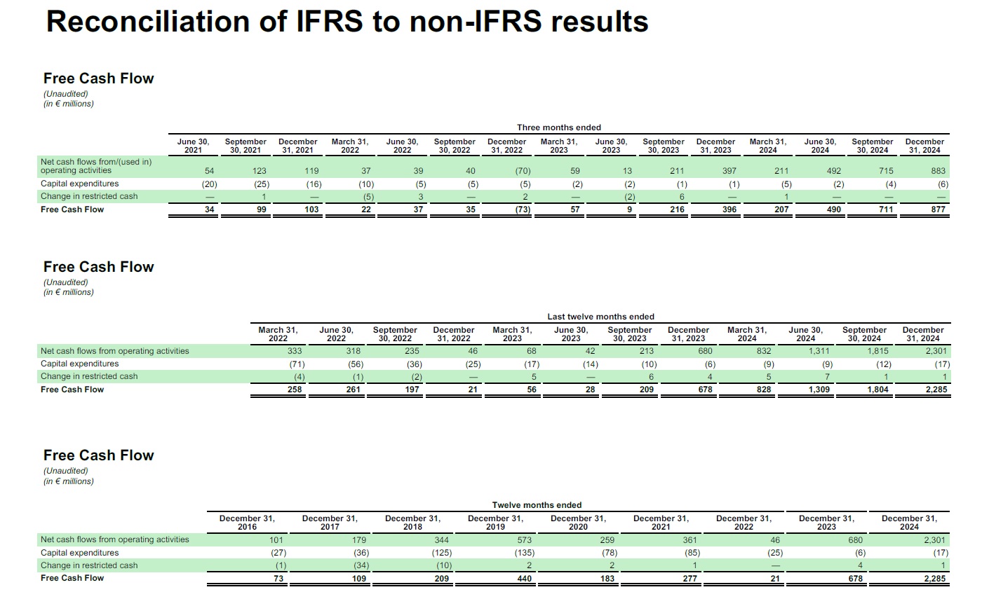 Three months ended  June 30,  2021  September 30, 2021  December 31, 2021  March 31,  2022  June 30,  2022  September 30, 2022  December 31, 2022  March 31,  2023  June 30,  2023  September 30, 2023  December 31, 2023  March 31,  2024  June 30,  2024  September 30, 2024  December 31, 2024  Net cash flows from/(used in)  operating activities  54  123  119  37  39  40  (70)  59  13  211  397  211  492  715  883  Capital expenditures  (20)  (25)  (16)  (10)  (5)  (5)  (5)  (2)  (2)  (1)  (1)  (5)  (2)  (4)  (6)  Change in restricted cash  —  1  —  (5)  3  —  2  —  (2)  6  —  1  —  —  —  Free Cash Flow  34  99  103  22  37  35  (73)  57  9  216  396  207  490  711  877  Free Cash Flow  (Unaudited)  (in € millions)  Last twelve  months ended  March 31,  June 30,  September  December  March 31,  June 30,  September  December  March 31,  June 30,  September  December  2022  2022  30, 2022  31, 2022  2023  2023  30, 2023  31, 2023  2024  2024  30, 2024  31, 2024  Net cash flows from operating activities  333  318  235  46  68  42  213  680  832  1,311  1,815  2,301  Capital expenditures  (71)  (56)  (36)  (25)  (17)  (14  ) (10)  (6)  (9)  (9)  (12)  (17)  Change in restricted cash  (4)  (1)  (2)  —  5  —  6  4  5  7  1  1  Free Cash Flow  258  261  197  21  56  28  209  678  828  1,309  1,804  2,285  Reconciliation of IFRS to non-IFRS results  Free Cash Flow  (Unaudited) (in € millions)  Twelve months ended  December 31,  December 31,  December 31,  December 31,  December 31,  December 31,  December 31,  December 31,  December 31,  2016  2017  2018  2019  2020  2021  2022  2023  2024  Net cash flows from operating activities  101  179  344  573  259  361  46  680  2,301  Capital expenditures  (27)  (36)  (125)  (135)  (78)  (85)  (25)  (6)  (17)  Change in restricted cash  (1)  (34)  (10)  2  2  1  —  4  1  Free Cash Flow  73  109  209  440  183  277  21  678  2,285  Free Cash Flow  (Unaudited) (in € millions)