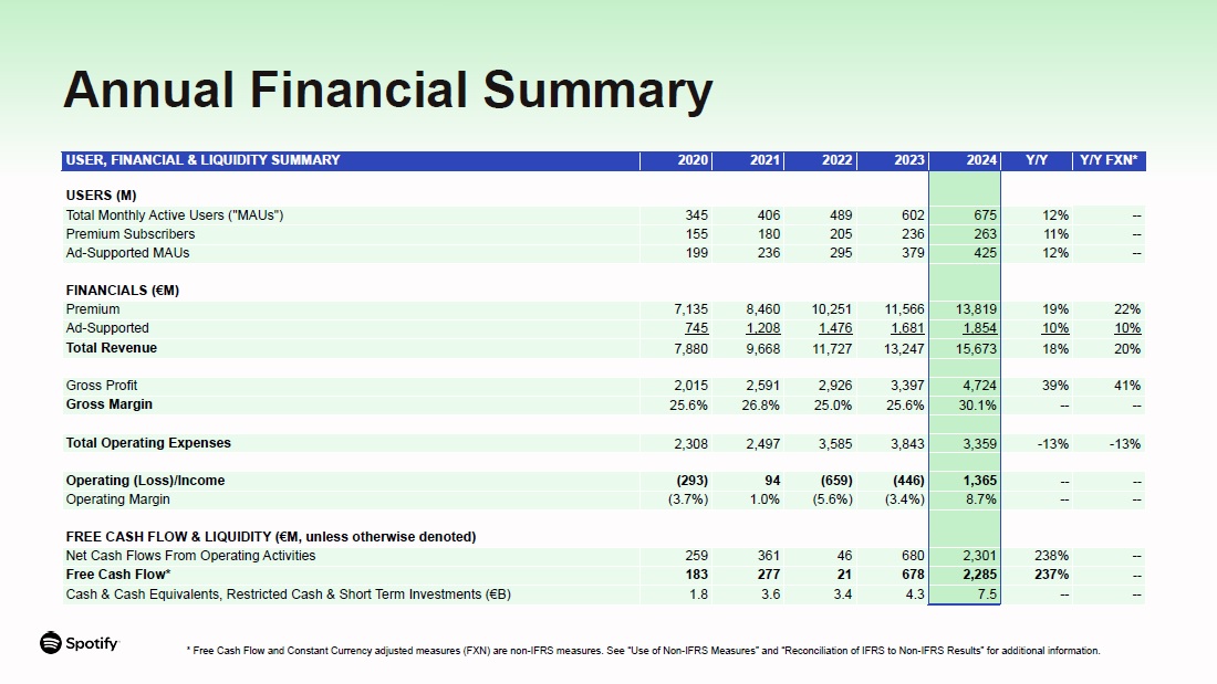 USER, FINANCIAL & LIQUIDITY SUMMARY  2020  2021  2022  2023  2024 Y/Y  Y/Y FXN*  USERS (M)  Total Monthly Active Users ("MAUs")  345  406  489  602  675  12%  --  Premium Subscribers  155  180  205  236  263  11%  --  Ad-Supported MAUs  199  236  295  379  425  12%  --  FINANCIALS (€M)  Premium  7,135  8,460  10,251  11,566  13,819  19%  22%  Ad-Supported  745  1,208  1,476  1,681  1,854  10%  10%  Total Revenue  7,880  9,668  11,727  13,247  15,673  18%  20%  Gross Profit  2,015  2,591  2,926  3,397  4,724  39%  41%  Gross Margin  25.6%  26.8%  25.0%  25.6%  30.1%  --  --  Total Operating Expenses  2,308  2,497  3,585  3,843  3,359  -13%  -13%  Operating (Loss)/Income  (293)  94  (659)  (446)  1,365  --  --  Operating Margin  (3.7%)  1.0%  (5.6%)  (3.4%)  8.7%  --  --  FREE CASH FLOW & LIQUIDITY (€M, unless otherwise denoted)  Net Cash Flows From Operating Activities  259  361  46  680  2,301  238%  --  Free Cash Flow*  183  277  21  678  2,285  237%  --  Cash & Cash Equivalents, Restricted Cash & Short Term Investments (€B)  1.8  3.6  3.4  4.3  7.5  --  --  * Free Cash Flow and Constant Currency adjusted measures (FXN) are non-IFRS measures. See “Use of Non-IFRS Measures” and “Reconciliation of IFRS to Non-IFRS Results” for additional information.  Annual Financial Summary