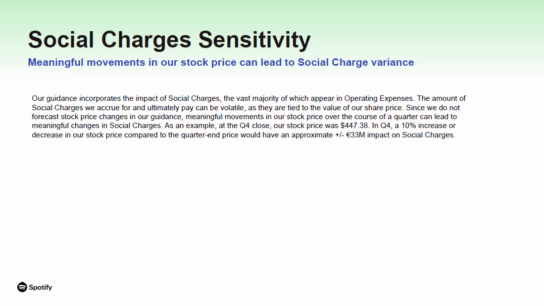 Social Charges Sensitivity  Meaningful movements in our stock price can lead to Social Charge variance  Our guidance incorporates the impact of Social Charges, the vast majority of which appear in Operating Expenses. The amount of Social Charges we accrue for and ultimately pay can be volatile, as they are tied to the value of our share price. Since we do not forecast stock price changes in our guidance, meaningful movements in our stock price over the course of a quarter can lead to meaningful changes in Social Charges. As an example, at the Q4 close, our stock price was $447.38. In Q4, a 10% increase or decrease in our stock price compared to the quarter-end price would have an approximate +/- €33M impact on Social Charges.