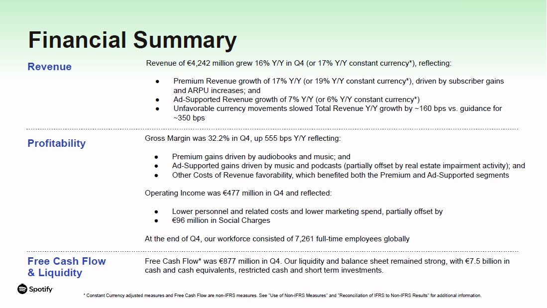 Revenue  Profitability  Free Cash Flow & Liquidity  Gross Margin was 32.2% in Q4, up 555 bps Y/Y reflecting:  Premium gains driven by audiobooks and music; and  Ad-Supported gains driven by music and podcasts (partially offset by real estate impairment activity); and  Other Costs of Revenue favorability, which benefited both the Premium and Ad-Supported segments  Operating Income was €477 million in Q4 and reflected:  Lower personnel and related costs and lower marketing spend, partially offset by  €96 million in Social Charges  At the end of Q4, our workforce consisted of 7,261 full-time employees globally  Revenue of €4,242 million grew 16% Y/Y in Q4 (or 17% Y/Y constant currency*), reflecting:  Premium Revenue growth of 17% Y/Y (or 19% Y/Y constant currency*), driven by subscriber gains and ARPU increases; and  Ad-Supported Revenue growth of 7% Y/Y (or 6% Y/Y constant currency*)  Unfavorable currency movements slowed Total Revenue Y/Y growth by ~160 bps vs. guidance for  ~350 bps  Free Cash Flow* was €877 million in Q4. Our liquidity and balance sheet remained strong, with €7.5 billion in cash and cash equivalents, restricted cash and short term investments.  Financial Summary  * Constant Currency adjusted measures and Free Cash Flow are non-IFRS measures. See "Use of Non-IFRS Measures" and "Reconciliation of IFRS to Non-IFRS Results" for additional information.