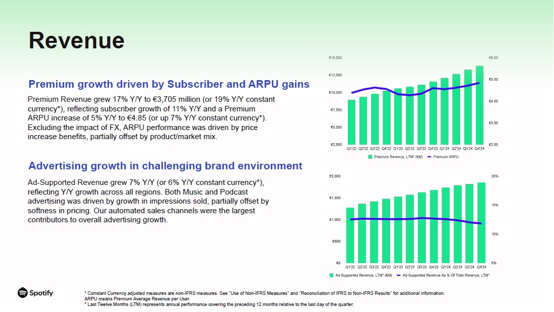 Revenue  Constant Currency adjusted measures are non-IFRS measures. See "Use of Non-IFRS Measures" and "Reconciliation of IFRS to Non-IFRS Results" for additional information. ARPU means Premium Average Revenue per User.  Last Twelve Months (LTM) represents annual performance covering the preceding 12 months relative to the last day of the quarter.  Premium growth driven by Subscriber and ARPU gains  Premium Revenue grew 17% Y/Y to €3,705 million (or 19% Y/Y constant currency*), reflecting subscriber growth of 11% Y/Y and a Premium ARPU increase of 5% Y/Y to €4.85 (or up 7% Y/Y constant currency*).  Excluding the impact of FX, ARPU performance was driven by price increase benefits, partially offset by product/market mix.  Advertising growth in challenging brand environment  Ad-Supported Revenue grew 7% Y/Y (or 6% Y/Y constant currency*), reflecting Y/Y growth across all regions. Both Music and Podcast advertising was driven by growth in impressions sold, partially offset by softness in pricing. Our automated sales channels were the largest contributors to overall advertising growth.