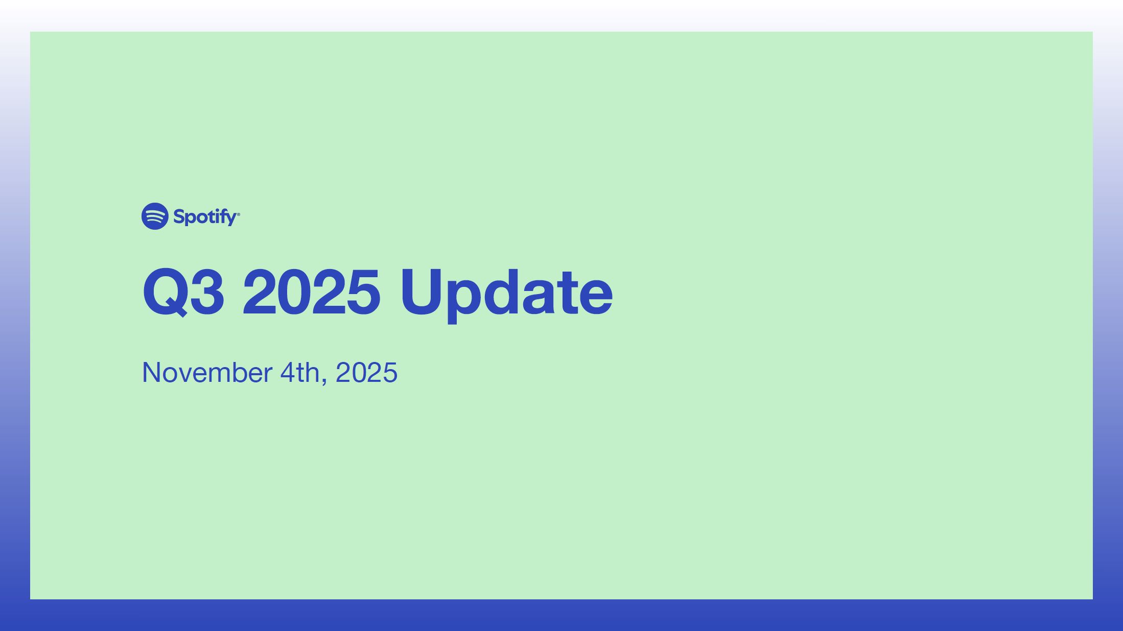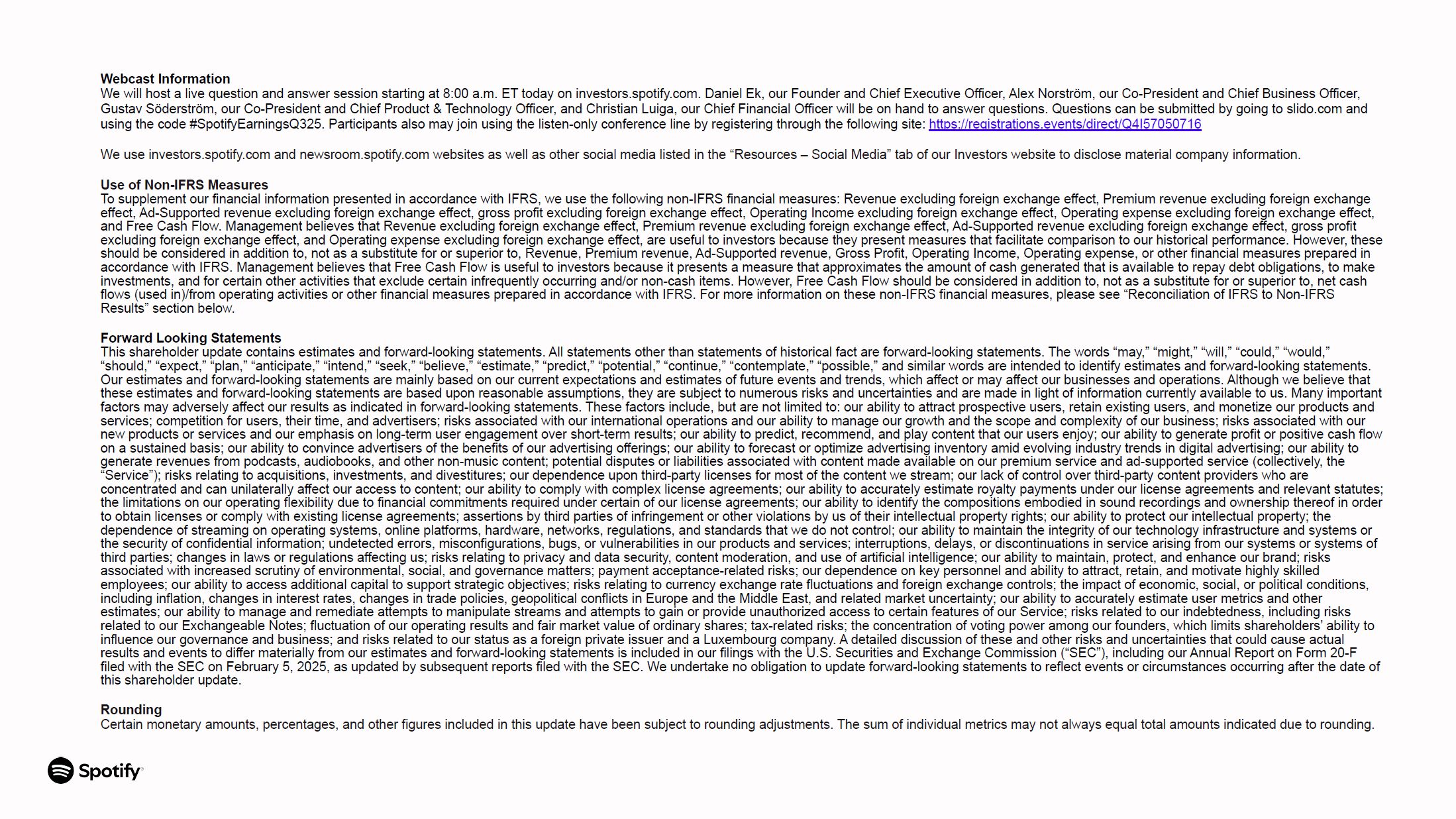 Webcast Information  We will host a live question and answer session starting at 8:00 a.m. ET today on investors.spotify.com. Daniel Ek, our Founder and Chief Executive Officer, Alex Norström, our Co-President and Chief Business Officer, Gustav Söderström, our Co-President and Chief Product & Technology Officer, and Christian Luiga, our Chief Financial Officer will be on hand to answer questions. Questions can be submitted by going to slido.com and using the code #SpotifyEarningsQ325. Participants also may join using the listen-only conference line by registering through the following site: https://registrations.events/direct/Q4I57050716  We use investors.spotify.com and newsroom.spotify.com websites as well as other social media listed in the “Resources – Social Media” tab of our Investors website to disclose material company information.  Use of Non-IFRS Measures  To supplement our financial information presented in accordance with IFRS, we use the following non-IFRS financial measures: Revenue excluding foreign exchange effect, Premium revenue excluding foreign exchange effect, Ad-Supported revenue excluding foreign exchange effect, gross profit excluding foreign exchange effect, Operating Income excluding foreign exchange effect, Operating expense excluding foreign exchange effect, and Free Cash Flow. Management believes that Revenue excluding foreign exchange effect, Premium revenue excluding foreign exchange effect, Ad-Supported revenue excluding foreign exchange effect, gross profit excluding foreign exchange effect, and Operating expense excluding foreign exchange effect, are useful to investors because they present measures that facilitate comparison to our historical performance. However, these should be considered in addition to, not as a substitute for or superior to, Revenue, Premium revenue, Ad-Supported revenue, Gross Profit, Operating Income, Operating expense, or other financial measures prepared in accordance with IFRS. Management believes that Free Cash Flow is useful to investors because it presents a measure that approximates the amount of cash generated that is available to repay debt obligations, to make investments, and for certain other activities that exclude certain infrequently occurring and/or non-cash items. However, Free Cash Flow should be considered in addition to, not as a substitute for or superior to, net cash flows (used in)/from operating activities or other financial measures prepared in accordance with IFRS. For more information on these non-IFRS financial measures, please see “Reconciliation of IFRS to Non-IFRS Results” section below.  Forward Looking Statements  This shareholder update contains estimates and forward-looking statements. All statements other than statements of historical fact are forward-looking statements. The words “may,” “might,” “will,” “could,” “would,” “should,” “expect,” “plan,” “anticipate,” “intend,” “seek,” “believe,” “estimate,” “predict,” “potential,” “continue,” “contemplate,” “possible,” and similar words are intended to identify estimates and forward-looking statements. Our estimates and forward-looking statements are mainly based on our current expectations and estimates of future events and trends, which affect or may affect our businesses and operations. Although we believe that these estimates and forward-looking statements are based upon reasonable assumptions, they are subject to numerous risks and uncertainties and are made in light of information currently available to us. Many important factors may adversely affect our results as indicated in forward-looking statements. These factors include, but are not limited to: our ability to attract prospective users, retain existing users, and monetize our products and services; competition for users, their time, and advertisers; risks associated with our international operations and our ability to manage our growth and the scope and complexity of our business; risks associated with our new products or services and our emphasis on long-term user engagement over short-term results; our ability to predict, recommend, and play content that our users enjoy; our ability to generate profit or positive cash flow on a sustained basis; our ability to convince advertisers of the benefits of our advertising offerings; our ability to forecast or optimize advertising inventory amid evolving industry trends in digital advertising; our ability to generate revenues from podcasts, audiobooks, and other non-music content; potential disputes or liabilities associated with content made available on our premium service and ad-supported service (collectively, the “Service”); risks relating to acquisitions, investments, and divestitures; our dependence upon third-party licenses for most of the content we stream; our lack of control over third-party content providers who are concentrated and can unilaterally affect our access to content; our ability to comply with complex license agreements; our ability to accurately estimate royalty payments under our license agreements and relevant statutes; the limitations on our operating flexibility due to financial commitments required under certain of our license agreements; our ability to identify the compositions embodied in sound recordings and ownership thereof in order to obtain licenses or comply with existing license agreements; assertions by third parties of infringement or other violations by us of their intellectual property rights; our ability to protect our intellectual property; the dependence of streaming on operating systems, online platforms, hardware, networks, regulations, and standards that we do not control; our ability to maintain the integrity of our technology infrastructure and systems or the security of confidential information; undetected errors, misconfigurations, bugs, or vulnerabilities in our products and services; interru