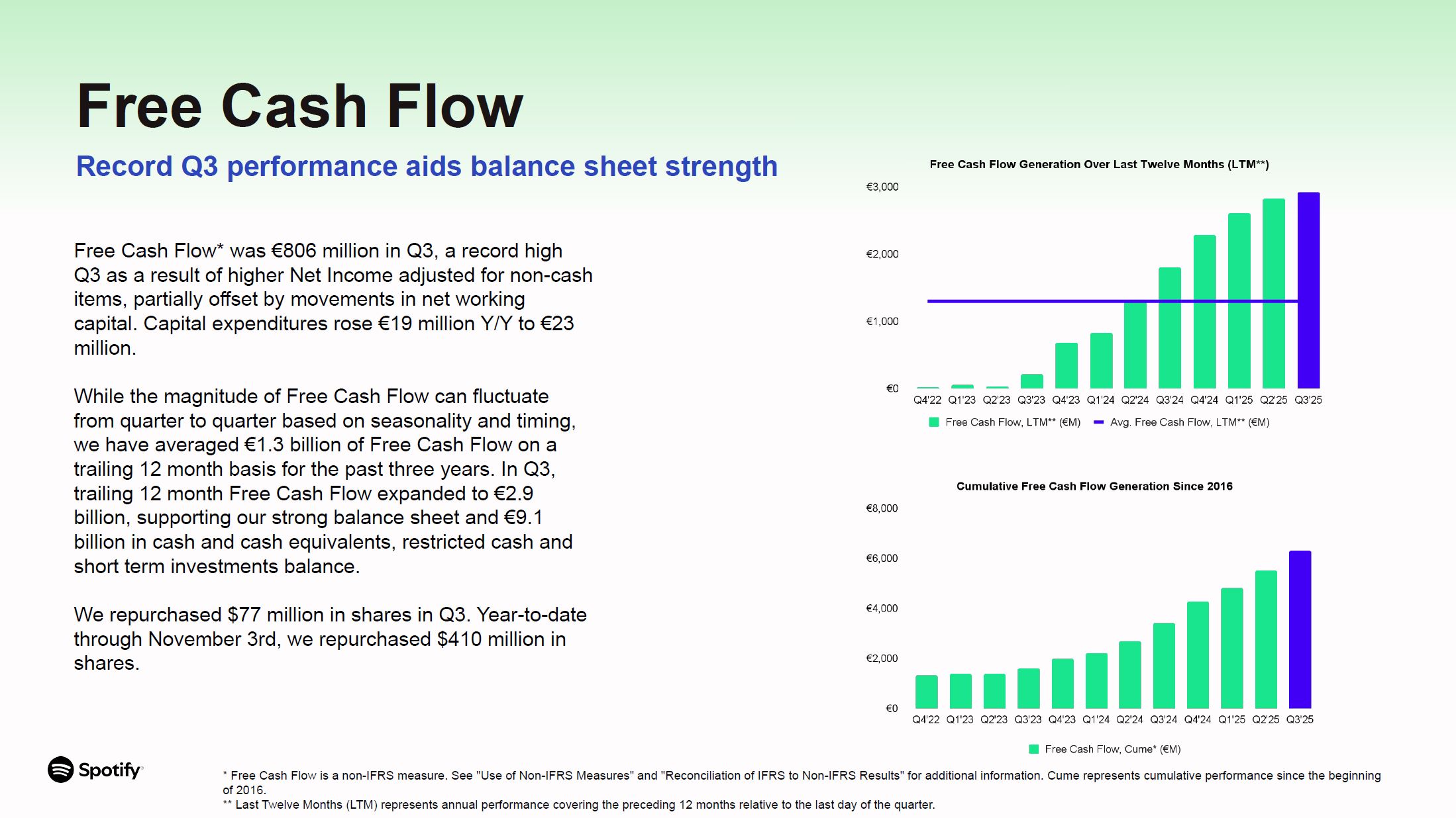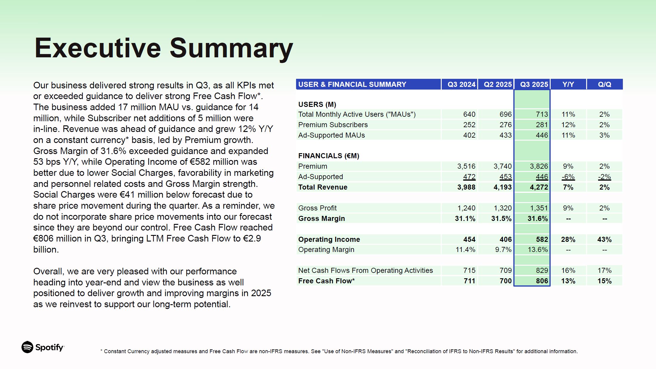 Executive Summary  USER & FINANCIAL SUMMARY  Q3 2024  Q2 2025  Q3 2025  Y/Y  Q/Q  USERS (M)  Total Monthly Active Users ("MAUs")  640  696  713  11%  2%  Premium Subscribers  252  276  281  12%  2%  Ad-Supported MAUs  402  433  446  11%  3%  FINANCIALS (€M)  Premium  3,516  3,740  3,826  9%  2%  Ad-Supported  472  453  446  -6%  -2%  Total Revenue  3,988  4,193  4,272  7%  2%  Gross Profit  1,240  1,320  1,351  9%  2%  Gross Margin  31.1%  31.5%  31.6%  --  --  Operating Income  454  406  582  28%  43%  Operating Margin  11.4%  9.7%  13.6%  --  --  Net Cash Flows From Operating Activities  715  709  829  16%  17%  Free Cash Flow*  711  700  806  13%  15%  * Constant Currency adjusted measures and Free Cash Flow are non-IFRS measures. See "Use of Non-IFRS Measures" and "Reconciliation of IFRS to Non-IFRS Results" for additional information.  Our business delivered strong results in Q3, as all KPIs met or exceeded guidance to deliver strong Free Cash Flow*.  The business added 17 million MAU vs. guidance for 14 million, while Subscriber net additions of 5 million were  in-line. Revenue was ahead of guidance and grew 12% Y/Y on a constant currency* basis, led by Premium growth.  Gross Margin of 31.6% exceeded guidance and expanded 53 bps Y/Y, while Operating Income of €582 million was better due to lower Social Charges, favorability in marketing and personnel related costs and Gross Margin strength.  Social Charges were €41 million below forecast due to share price movement during the quarter. As a reminder, we do not incorporate share price movements into our forecast since they are beyond our control. Free Cash Flow reached  €806 million in Q3, bringing LTM Free Cash Flow to €2.9 billion.  Overall, we are very pleased with our performance heading into year-end and view the business as well positioned to deliver growth and improving margins in 2025 as we reinvest to support our long-term potential.