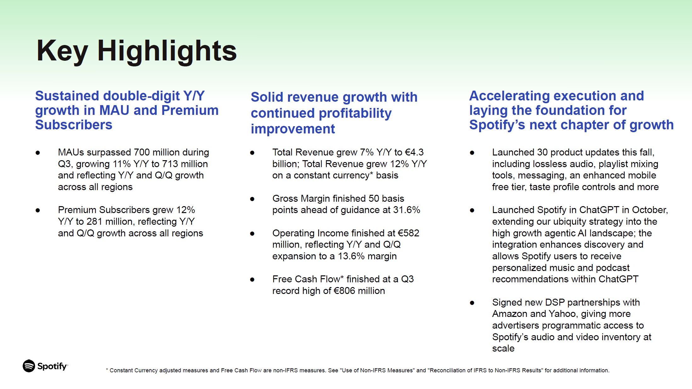 * Constant Currency adjusted measures and Free Cash Flow are non-IFRS measures. See "Use of Non-IFRS Measures" and "Reconciliation of IFRS to Non-IFRS Results" for additional information.  Sustained double-digit Y/Y  growth in MAU and Premium Subscribers  Launched 30 product updates this fall, including lossless audio, playlist mixing tools, messaging, an enhanced mobile free tier, taste profile controls and more  Launched Spotify in ChatGPT in October, extending our ubiquity strategy into the high growth agentic AI landscape; the integration enhances discovery and allows Spotify users to receive personalized music and podcast recommendations within ChatGPT  Signed new DSP partnerships with Amazon and Yahoo, giving more advertisers programmatic access to Spotify’s audio and video inventory at scale  Key Highlights  Solid revenue growth with  continued profitability improvement  Total Revenue grew 7% Y/Y to €4.3 billion; Total Revenue grew 12% Y/Y on a constant currency* basis  Gross Margin finished 50 basis points ahead of guidance at 31.6%  Operating Income finished at €582 million, reflecting Y/Y and Q/Q expansion to a 13.6% margin  Free Cash Flow* finished at a Q3 record high of €806 million  Accelerating execution and  laying the foundation for Spotify’s next chapter of growth  MAUs surpassed 700 million during Q3, growing 11% Y/Y to 713 million and reflecting Y/Y and Q/Q growth across all regions  Premium Subscribers grew 12% Y/Y to 281 million, reflecting Y/Y and Q/Q growth across all regions