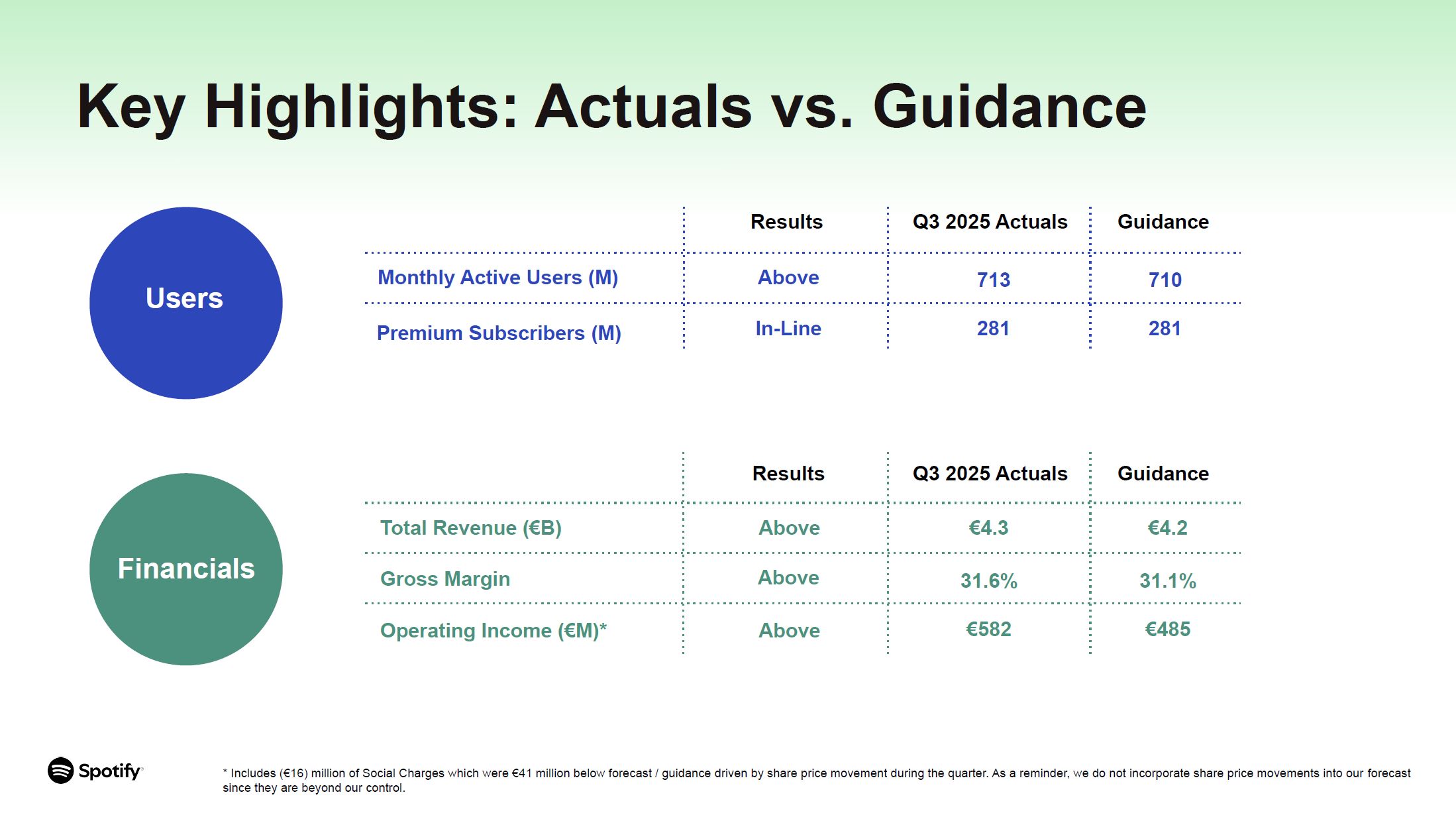 Results  Q3 2025 Actuals  Guidance  Total Revenue (€B)  Above  €4.3  €4.2  Gross Margin  Above  31.6%  31.1%  Operating Income (€M)*  Above  €582  €485  Key Highlights: Actuals vs. Guidance  Users  Results  Q3 2025 Actuals  Guidance  Monthly Active Users (M)  Above  713  710  Premium Subscribers (M)  In-Line  281  281  Financials  * Includes (€16) million of Social Charges which were €41 million below forecast / guidance driven by share price movement during the quarter. As a reminder, we do not incorporate share price movements into our forecast since they are beyond our control.