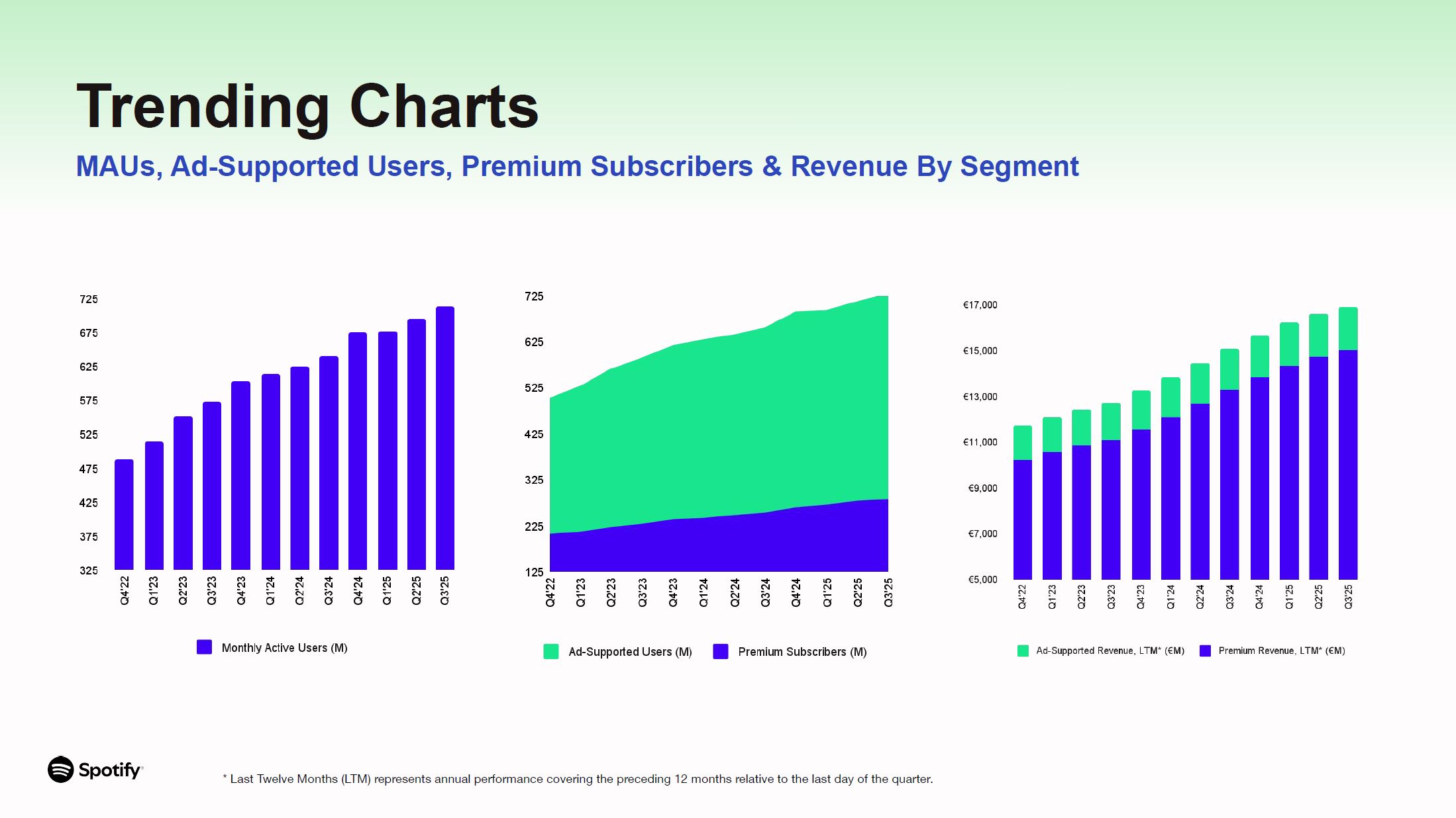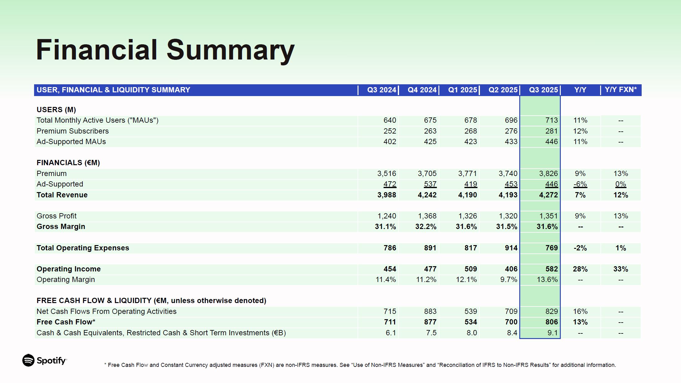 USER, FINANCIAL & LIQUIDITY SUMMARY  Q3 2024  Q4 2024  Q1 2025  Q2 2025 Q3 2025 Y/Y  Y/Y FXN*  USERS (M)  Total Monthly Active Users ("MAUs")  640  675  678  696  713  11%  --  Premium Subscribers  252  263  268  276  281  12%  --  Ad-Supported MAUs  402  425  423  433  446  11%  --  FINANCIALS (€M)  Premium  3,516  3,705  3,771  3,740  3,826  9%  13%  Ad-Supported  472  537  419  453  446  -6%  0%  Total Revenue  3,988  4,242  4,190  4,193  4,272  7%  12%  Gross Profit  1,240  1,368  1,326  1,320  1,351  9%  13%  Gross Margin  31.1%  32.2%  31.6%  31.5%  31.6%  --  --  Total Operating Expenses  786  891  817  914  769  -2%  1%  Operating Income  454  477  509  406  582  28%  33%  Operating Margin  11.4%  11.2%  12.1%  9.7%  13.6%  --  --  FREE CASH FLOW & LIQUIDITY (€M, unless otherwise denoted)  Net Cash Flows From Operating Activities  715  883  539  709  829  16%  --  Free Cash Flow*  711  877  534  700  806  13%  --  Cash & Cash Equivalents, Restricted Cash & Short Term Investments (€B)  6.1  7.5  8.0  8.4  9.1  --  --  Financial Summary  * Free Cash Flow and Constant Currency adjusted measures (FXN) are non-IFRS measures. See “Use of Non-IFRS Measures” and “Reconciliation of IFRS to Non-IFRS Results” for additional information.