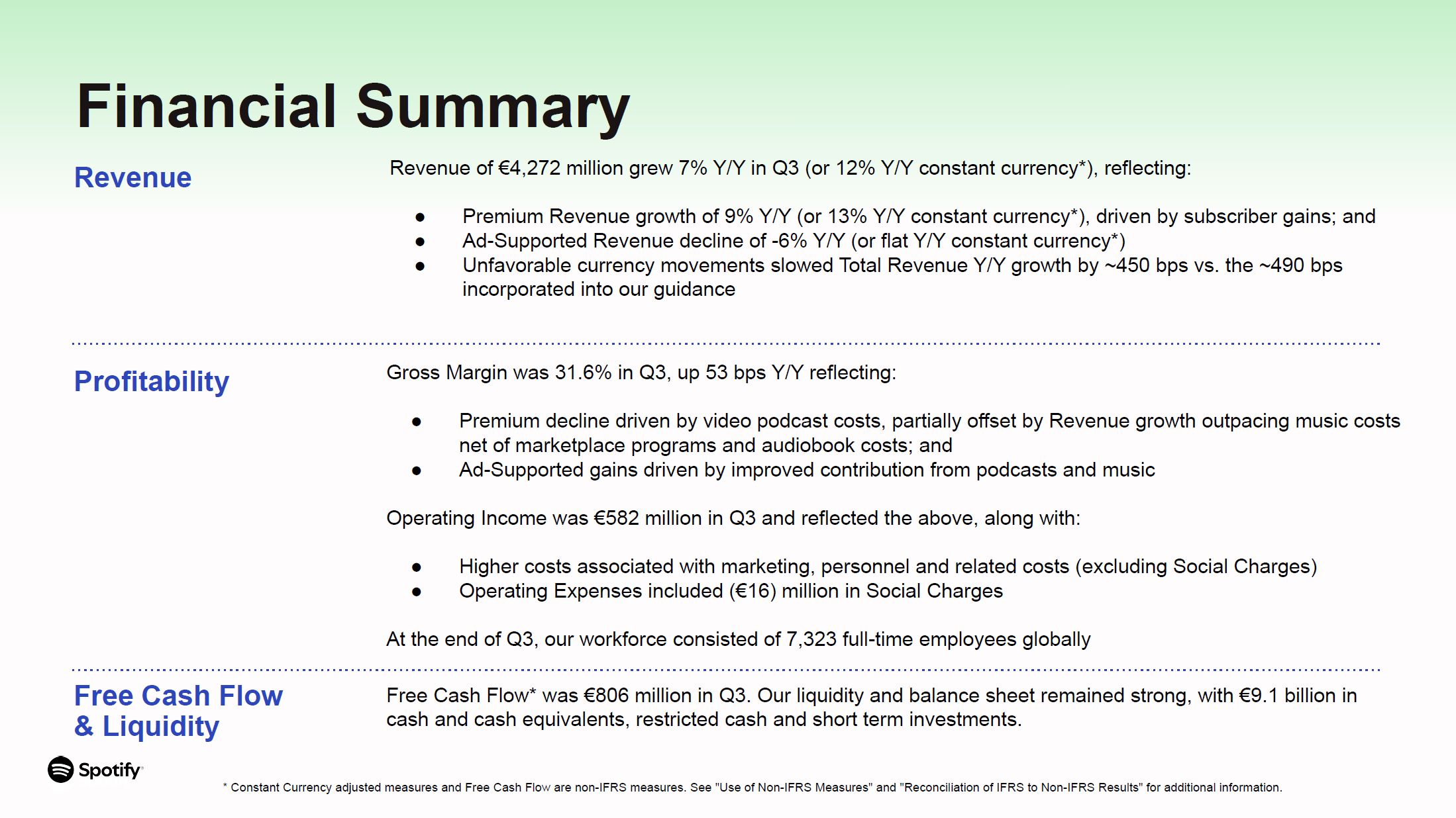 Revenue  Profitability  Free Cash Flow & Liquidity  Gross Margin was 31.6% in Q3, up 53 bps Y/Y reflecting:  Premium decline driven by video podcast costs, partially offset by Revenue growth outpacing music costs net of marketplace programs and audiobook costs; and  Ad-Supported gains driven by improved contribution from podcasts and music  Operating Income was €582 million in Q3 and reflected the above, along with:  Higher costs associated with marketing, personnel and related costs (excluding Social Charges)  Operating Expenses included (€16) million in Social Charges  At the end of Q3, our workforce consisted of 7,323 full-time employees globally  Revenue of €4,272 million grew 7% Y/Y in Q3 (or 12% Y/Y constant currency*), reflecting:  Premium Revenue growth of 9% Y/Y (or 13% Y/Y constant currency*), driven by subscriber gains; and  Ad-Supported Revenue decline of -6% Y/Y (or flat Y/Y constant currency*)  Unfavorable currency movements slowed Total Revenue Y/Y growth by ~450 bps vs. the ~490 bps incorporated into our guidance  Free Cash Flow* was €806 million in Q3. Our liquidity and balance sheet remained strong, with €9.1 billion in cash and cash equivalents, restricted cash and short term investments.  Financial Summary  * Constant Currency adjusted measures and Free Cash Flow are non-IFRS measures. See "Use of Non-IFRS Measures" and "Reconciliation of IFRS to Non-IFRS Results" for additional information.
