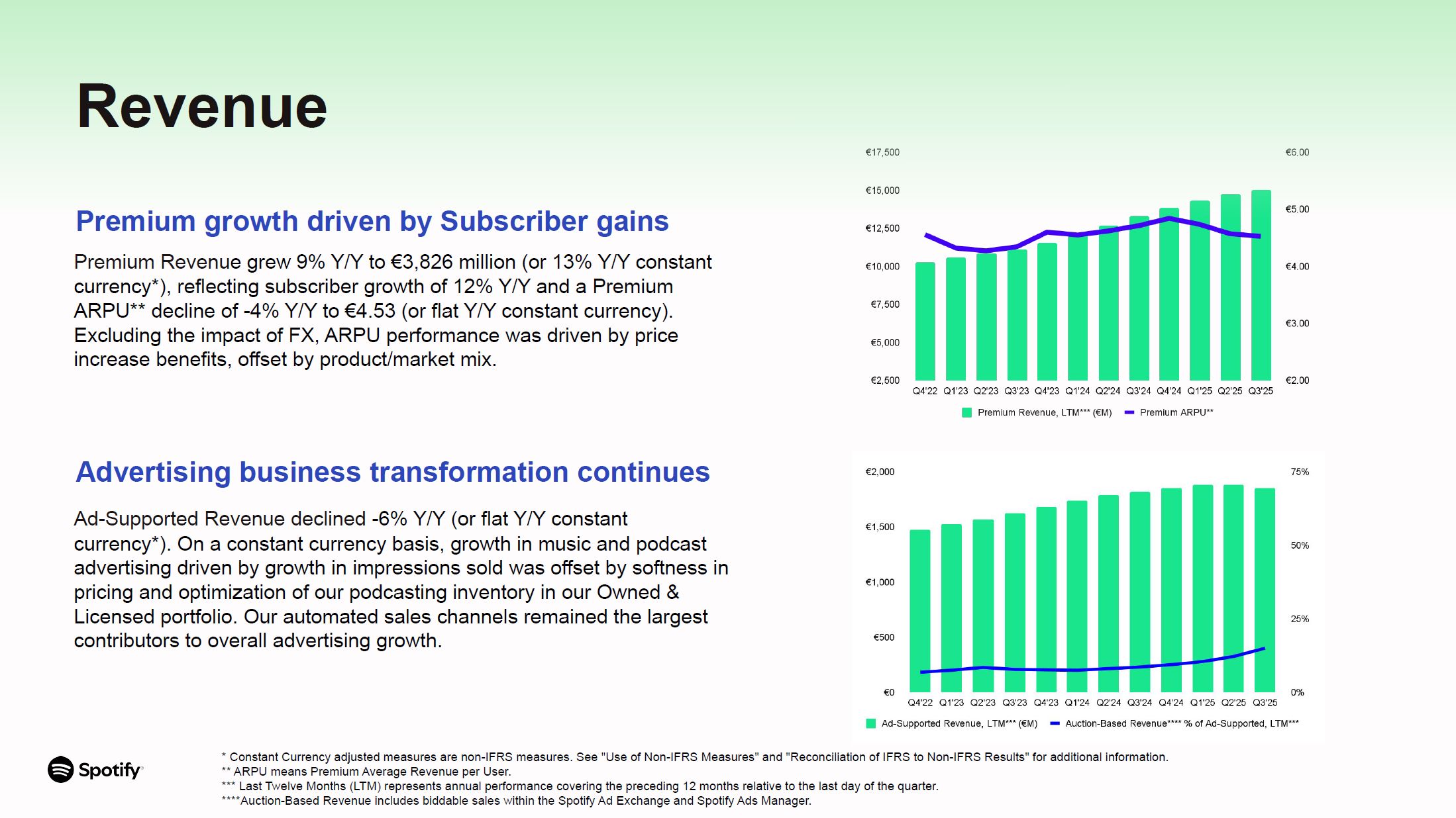 Advertising business transformation continues  Ad-Supported Revenue declined -6% Y/Y (or flat Y/Y constant currency*). On a constant currency basis, growth in music and podcast advertising driven by growth in impressions sold was offset by softness in pricing and optimization of our podcasting inventory in our Owned & Licensed portfolio. Our automated sales channels remained the largest contributors to overall advertising growth.  Revenue  * Constant Currency adjusted measures are non-IFRS measures. See "Use of Non-IFRS Measures" and "Reconciliation of IFRS to Non-IFRS Results" for additional information.  ** ARPU means Premium Average Revenue per User.  *** Last Twelve Months (LTM) represents annual performance covering the preceding 12 months relative to the last day of the quarter.  ****Auction-Based Revenue includes biddable sales within the Spotify Ad Exchange and Spotify Ads Manager.  Premium growth driven by Subscriber gains  Premium Revenue grew 9% Y/Y to €3,826 million (or 13% Y/Y constant currency*), reflecting subscriber growth of 12% Y/Y and a Premium ARPU** decline of -4% Y/Y to €4.53 (or flat Y/Y constant currency).  Excluding the impact of FX, ARPU performance was driven by price increase benefits, offset by product/market mix.