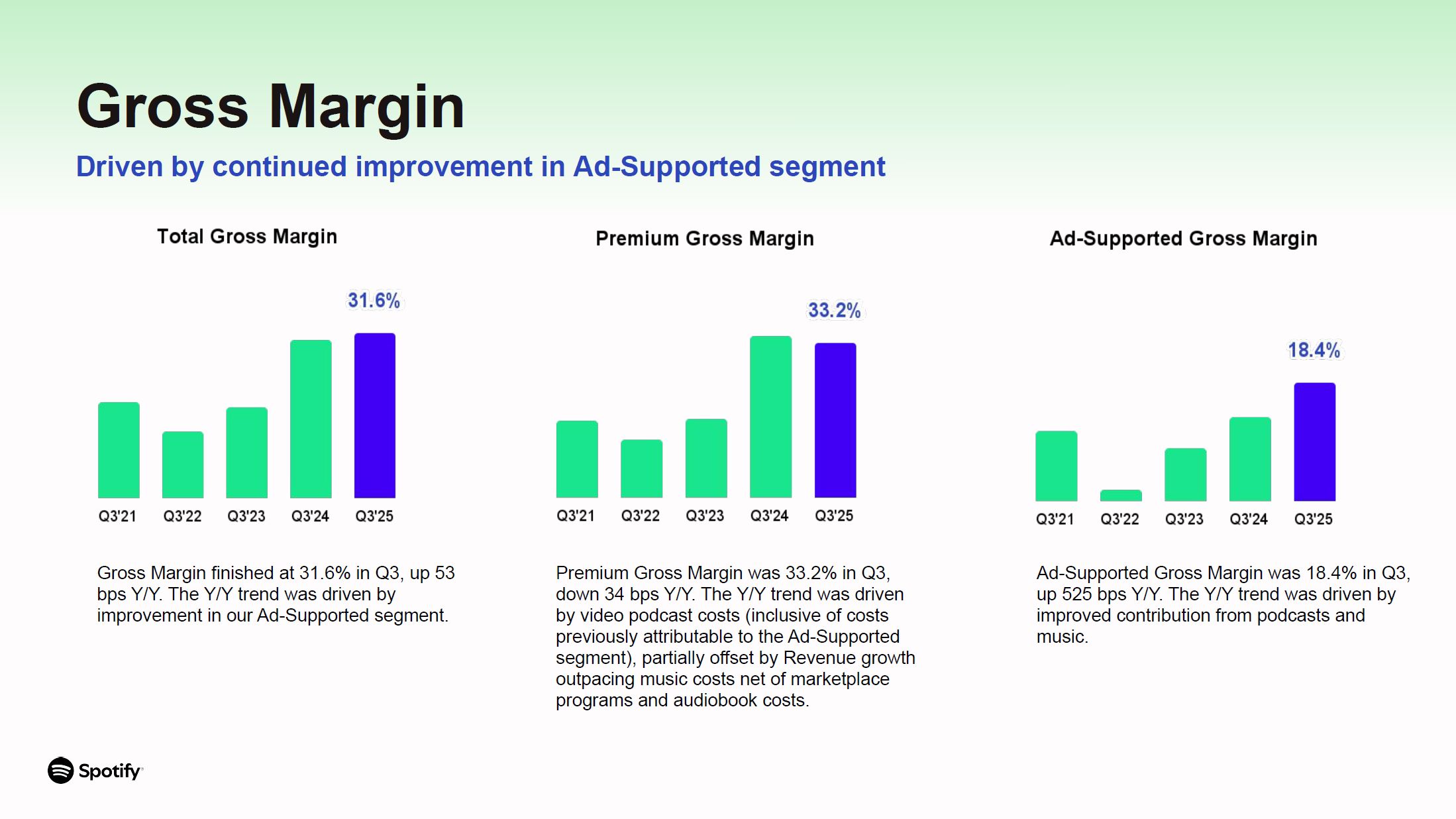 Premium Gross Margin was 33.2% in Q3, down 34 bps Y/Y. The Y/Y trend was driven by video podcast costs (inclusive of costs previously attributable to the Ad-Supported segment), partially offset by Revenue growth outpacing music costs net of marketplace programs and audiobook costs.  Gross Margin  Driven by continued improvement in Ad-Supported segment  Gross Margin finished at 31.6% in Q3, up 53 bps Y/Y. The Y/Y trend was driven by improvement in our Ad-Supported segment.  Ad-Supported Gross Margin was 18.4% in Q3, up 525 bps Y/Y. The Y/Y trend was driven by improved contribution from podcasts and music.