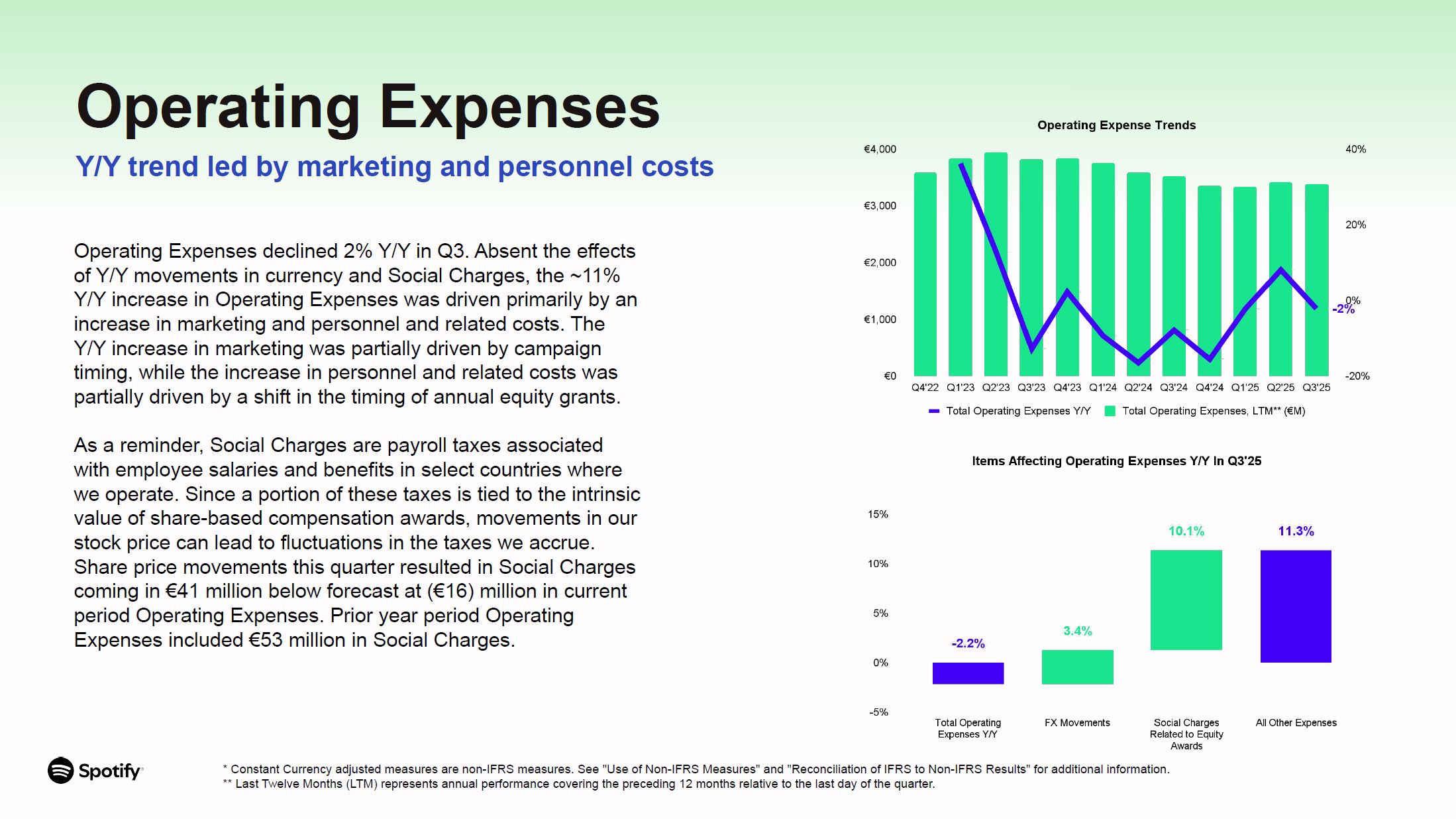 Operating Expenses declined 2% Y/Y in Q3. Absent the effects of Y/Y movements in currency and Social Charges, the ~11% Y/Y increase in Operating Expenses was driven primarily by an increase in marketing and personnel and related costs. The Y/Y increase in marketing was partially driven by campaign timing, while the increase in personnel and related costs was partially driven by a shift in the timing of annual equity grants.  As a reminder, Social Charges are payroll taxes associated with employee salaries and benefits in select countries where we operate. Since a portion of these taxes is tied to the intrinsic value of share-based compensation awards, movements in our stock price can lead to fluctuations in the taxes we accrue.  Share price movements this quarter resulted in Social Charges coming in €41 million below forecast at (€16) million in current period Operating Expenses. Prior year period Operating Expenses included €53 million in Social Charges.  Operating Expenses  Y/Y trend led by marketing and personnel costs  * Constant Currency adjusted measures are non-IFRS measures. See "Use of Non-IFRS Measures" and "Reconciliation of IFRS to Non-IFRS Results" for additional information.  ** Last Twelve Months (LTM) represents annual performance covering the preceding 12 months relative to the last day of the quarter.