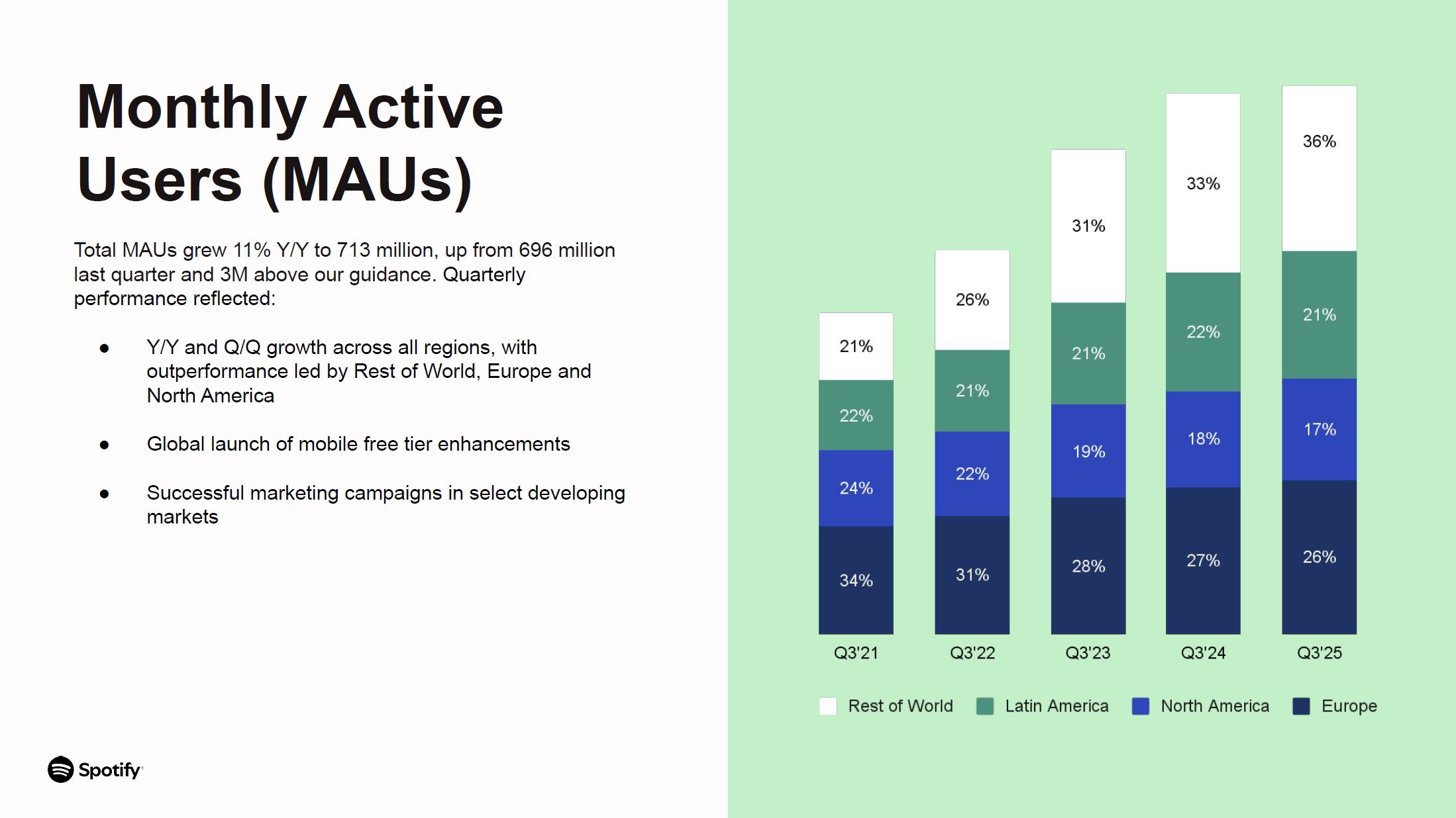 Total MAUs grew 11% Y/Y to 713 million, up from 696 million last quarter and 3M above our guidance. Quarterly performance reflected:  Y/Y and Q/Q growth across all regions, with outperformance led by Rest of World, Europe and North America  Global launch of mobile free tier enhancements  Successful marketing campaigns in select developing markets  Monthly Active Users (MAUs)