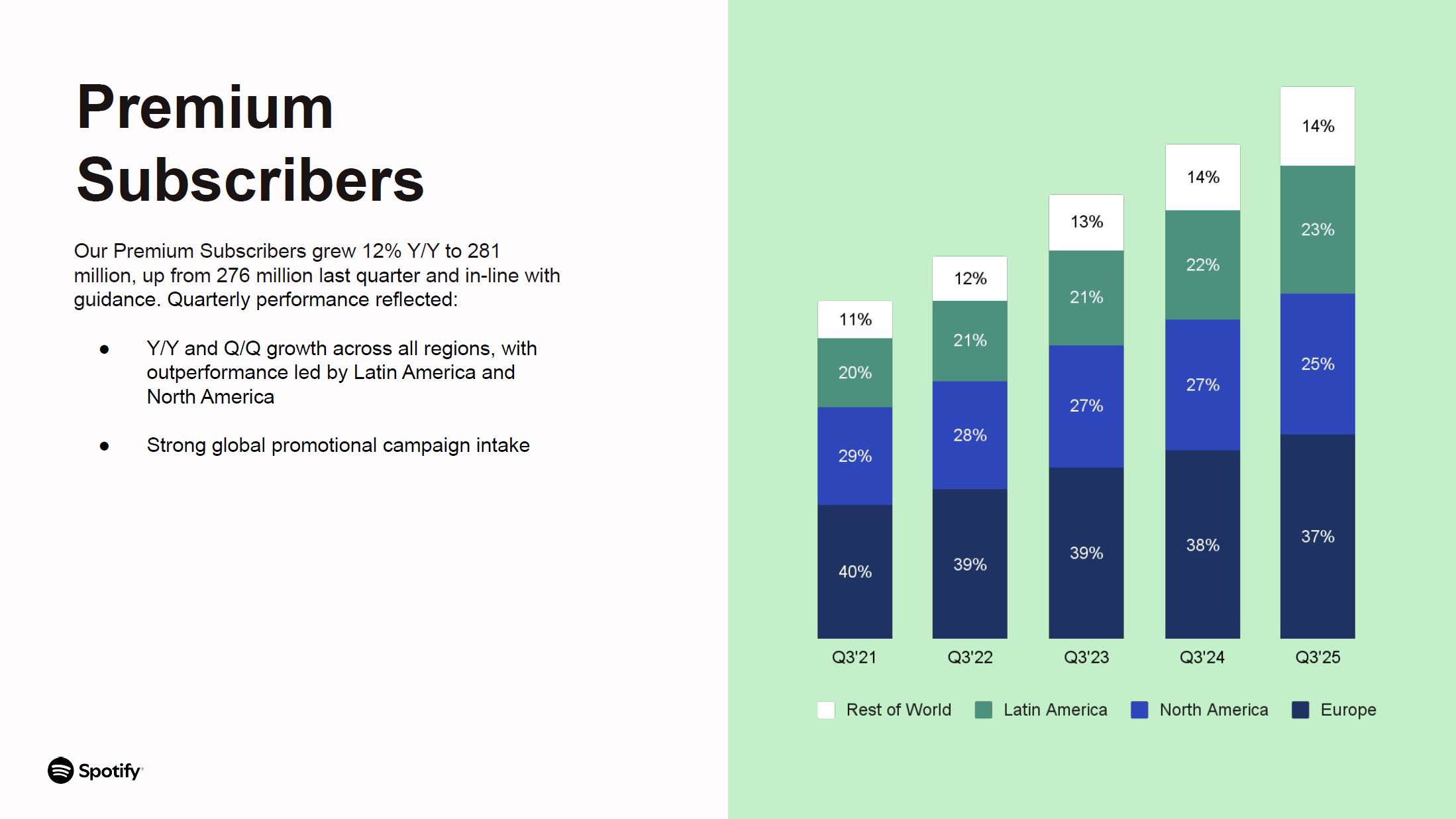 Our Premium Subscribers grew 12% Y/Y to 281 million, up from 276 million last quarter and in-line with guidance. Quarterly performance reflected:  Y/Y and Q/Q growth across all regions, with outperformance led by Latin America and North America  Strong global promotional campaign intake  Premium Subscribers