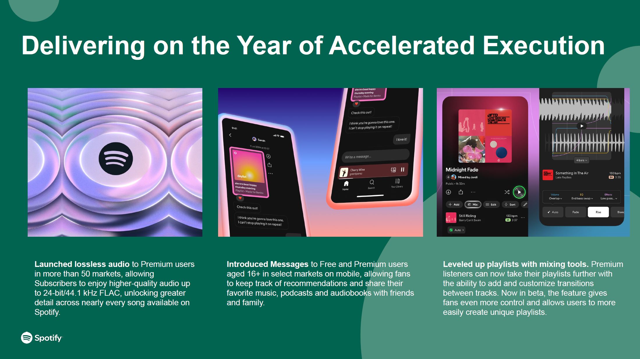 Delivering on the Year of Accelerated Execution  Launched lossless audio to Premium users in more than 50 markets, allowing Subscribers to enjoy higher-quality audio up to 24-bit/44.1 kHz FLAC, unlocking greater detail across nearly every song available on Spotify.  Leveled up playlists with mixing tools. Premium listeners can now take their playlists further with the ability to add and customize transitions between tracks. Now in beta, the feature gives fans even more control and allows users to more easily create unique playlists.  Introduced Messages to Free and Premium users aged 16+ in select markets on mobile, allowing fans to keep track of recommendations and share their favorite music, podcasts and audiobooks with friends and family.