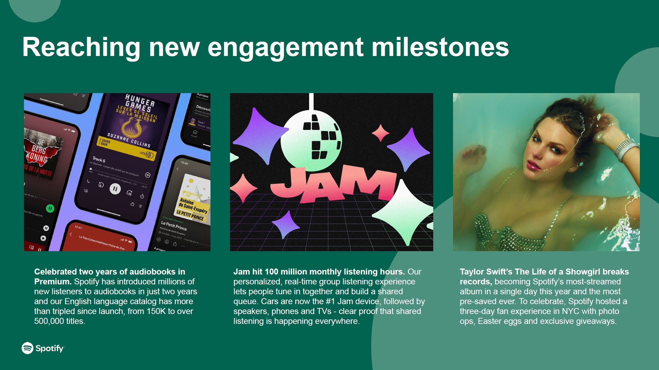 Reaching new engagement milestones  Taylor Swift’s The Life of a Showgirl breaks records, becoming Spotify’s most-streamed album in a single day this year and the most pre-saved ever. To celebrate, Spotify hosted a three-day fan experience in NYC with photo ops, Easter eggs and exclusive giveaways.  Jam hit 100 million monthly listening hours. Our personalized, real-time group listening experience lets people tune in together and build a shared queue. Cars are now the #1 Jam device, followed by speakers, phones and TVs - clear proof that shared listening is happening everywhere.  Celebrated two years of audiobooks in Premium. Spotify has introduced millions of new listeners to audiobooks in just two years and our English language catalog has more than tripled since launch, from 150K to over 500,000 titles.