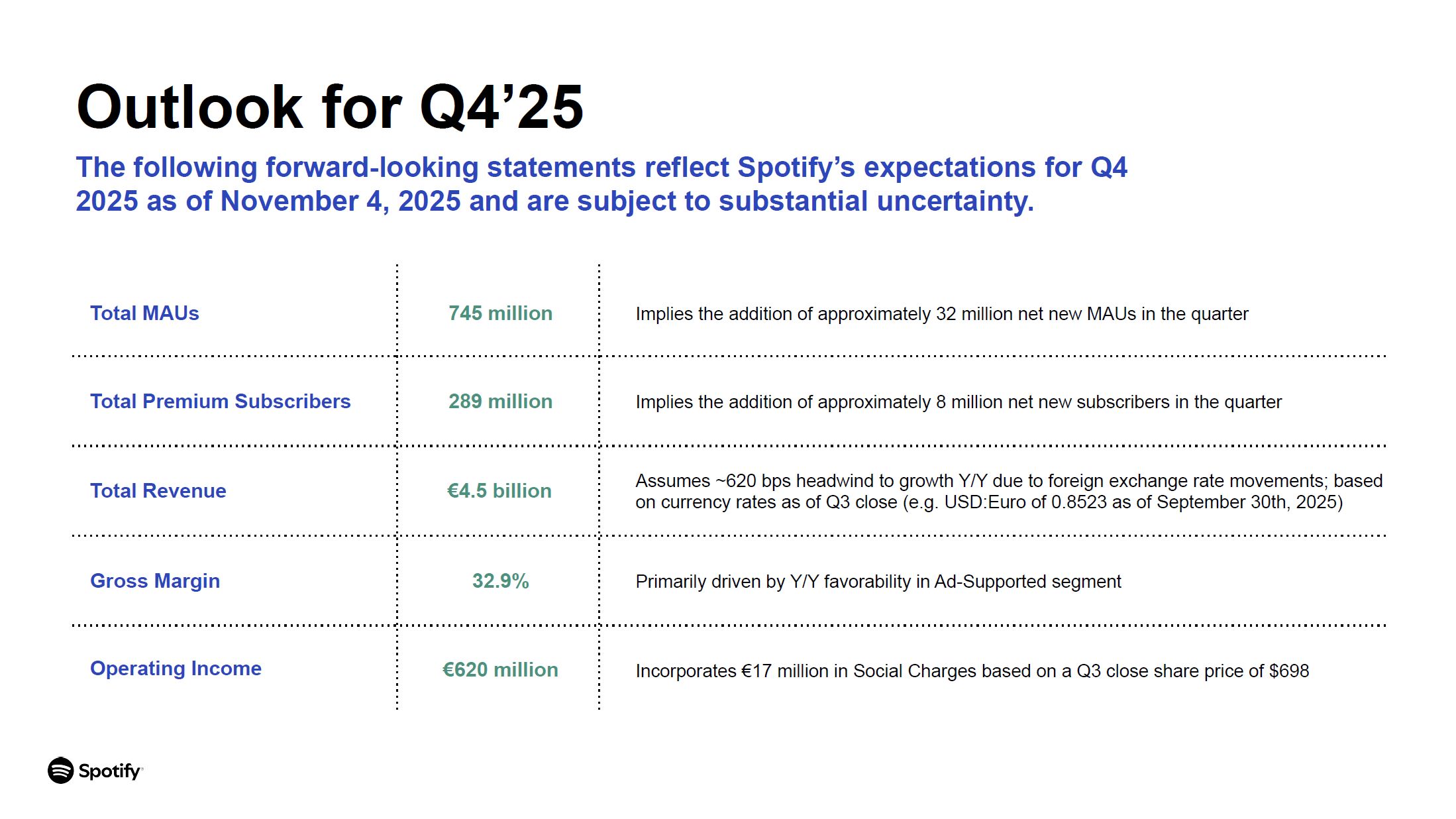 Outlook for Q4’25  The following forward-looking statements reflect Spotify’s expectations for Q4 2025 as of November 4, 2025 and are subject to substantial uncertainty.  Total MAUs  745 million  Implies the addition of approximately 32 million net new MAUs in the quarter  Total Premium Subscribers  289 million  Implies the addition of approximately 8 million net new subscribers in the quarter  Total Revenue  €4.5 billion  Assumes ~620 bps headwind to growth Y/Y due to foreign exchange rate movements; based on currency rates as of Q3 close (e.g. USD:Euro of 0.8523 as of September 30th, 2025)  Gross Margin  32.9%  Primarily driven by Y/Y favorability in Ad-Supported segment  Operating Income  €620 million  Incorporates €17 million in Social Charges based on a Q3 close share price of $698