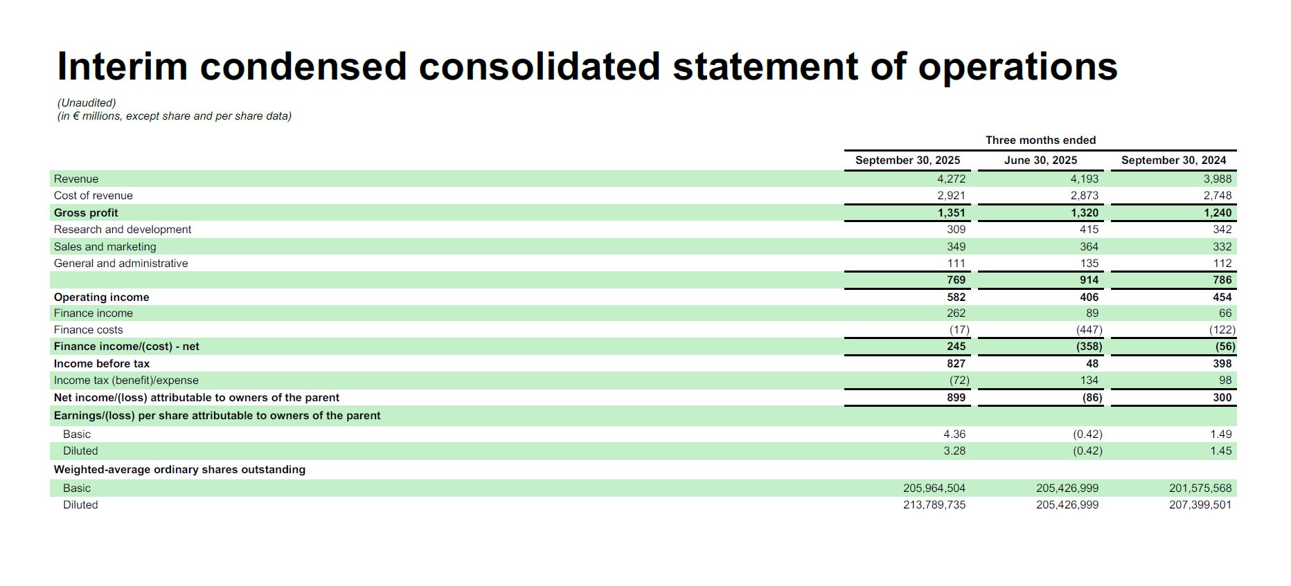 Interim condensed consolidated statement of operations  (Unaudited)  (in € millions, except share and per share data)  Three months ended  September 30, 2025  June 30, 2025  September 30, 2024  Revenue  4,272  4,193  3,988  Cost of revenue  2,921  2,873  2,748  Gross profit 1,351  1,320  1,240  Research and development  309  415  342  Sales and marketing 349  364  332  General and administrative  111  135  112  769  914  786  Operating income  582  406  454  Finance income 262  89  66  Finance costs  (17)  (447)  (122)  Finance income/(cost) - net 245  (358)  (56)  Income before tax  827  48  398  Income tax (benefit)/expense  (72)  134  98  Net income/(loss) attributable to owners of the parent  899  (86)  300  Earnings/(loss) per share attributable to owners of the parent  Basic  4.36  (0.42)  1.49  Diluted 3.28  (0.42)  1.45  Basic 205,964,504  205,426,999  201,575,568  Weighted-average ordinary shares outstanding  Diluted  213,789,735  205,426,999  207,399,501