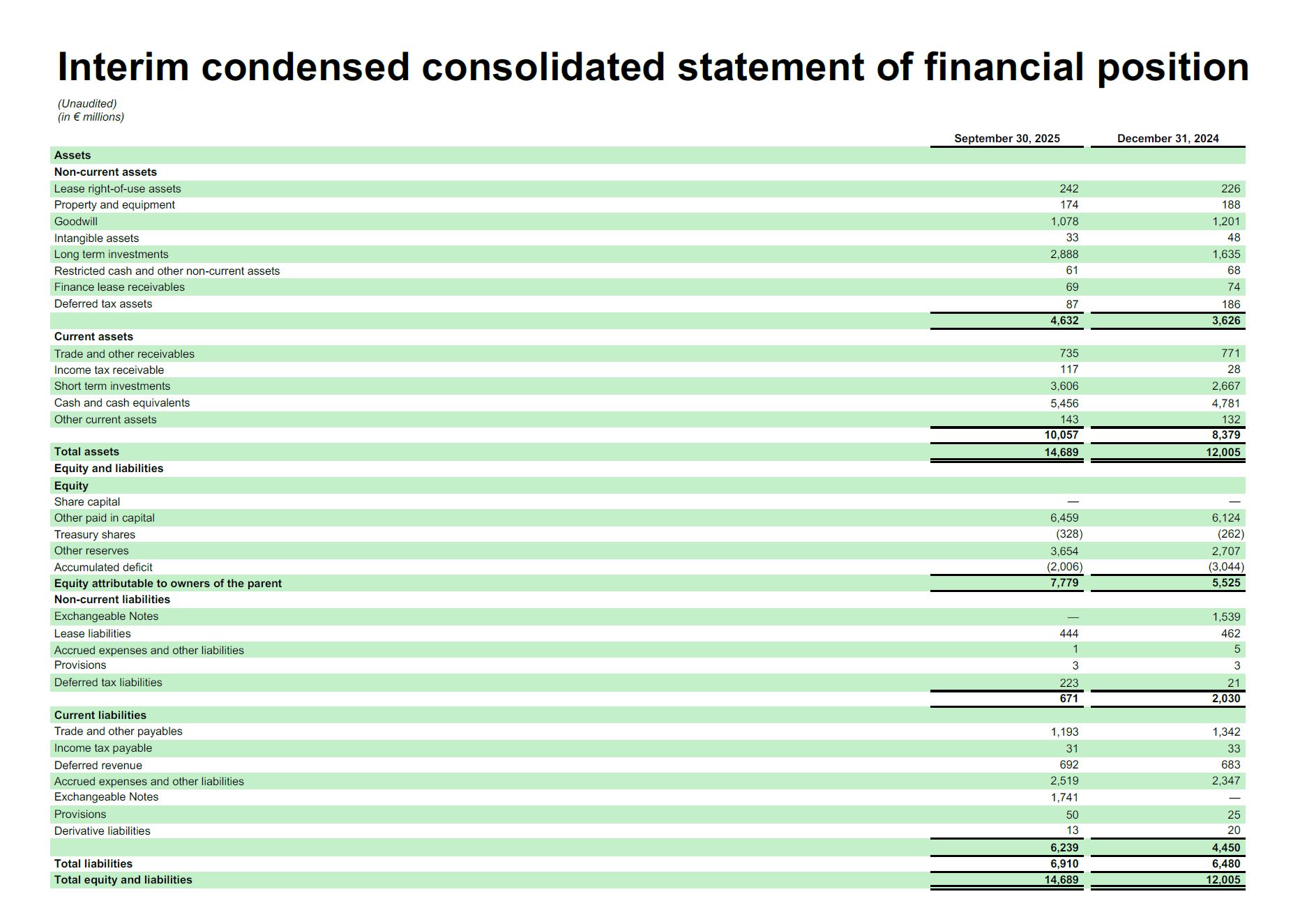 September 30, 2025  December 31, 2024  Assets  Non-current assets  Lease right-of-use assets  242  226  Property and equipment  174  188  Goodwill  1,078  1,201  Intangible assets  33  48  Long term investments  2,888  1,635  Restricted cash and other non-current assets  61  68  Finance lease receivables  69  74  Deferred tax assets  87  186  4,632  3,626  Current assets  Trade and other receivables  735  771  Income tax receivable  117  28  Short term investments  3,606  2,667  Cash and cash equivalents  5,456  4,781  Other current assets  143  132  10,057  8,379  Total assets   14,689  12,005  Equity and liabilities  Equity  Share capital  —  —  Other paid in capital  6,459  6,124  Treasury shares  (328)  (262)  Other reserves  3,654  2,707  Accumulated deficit  (2,006)  (3,044)  Equity attributable to owners of the parent  7,779  5,525  Non-current liabilities  Exchangeable Notes  —  1,539  Lease liabilities  444  462  Accrued expenses and other liabilities  1  5  Provisions  3  3  Deferred tax liabilities  223  21  671  2,030  Current liabilities  Trade and other payables  1,193  1,342  Income tax payable  31  33  Deferred revenue  692  683  Accrued expenses and other liabilities  2,519  2,347  Exchangeable Notes  1,741  —  Provisions  50  25  Derivative liabilities  13  20  6,239  4,450  Total liabilities  6,910  6,480  Total equity and liabilities   14,689  12,005  Interim condensed consolidated statement of financial position  (Unaudited) (in € millions)