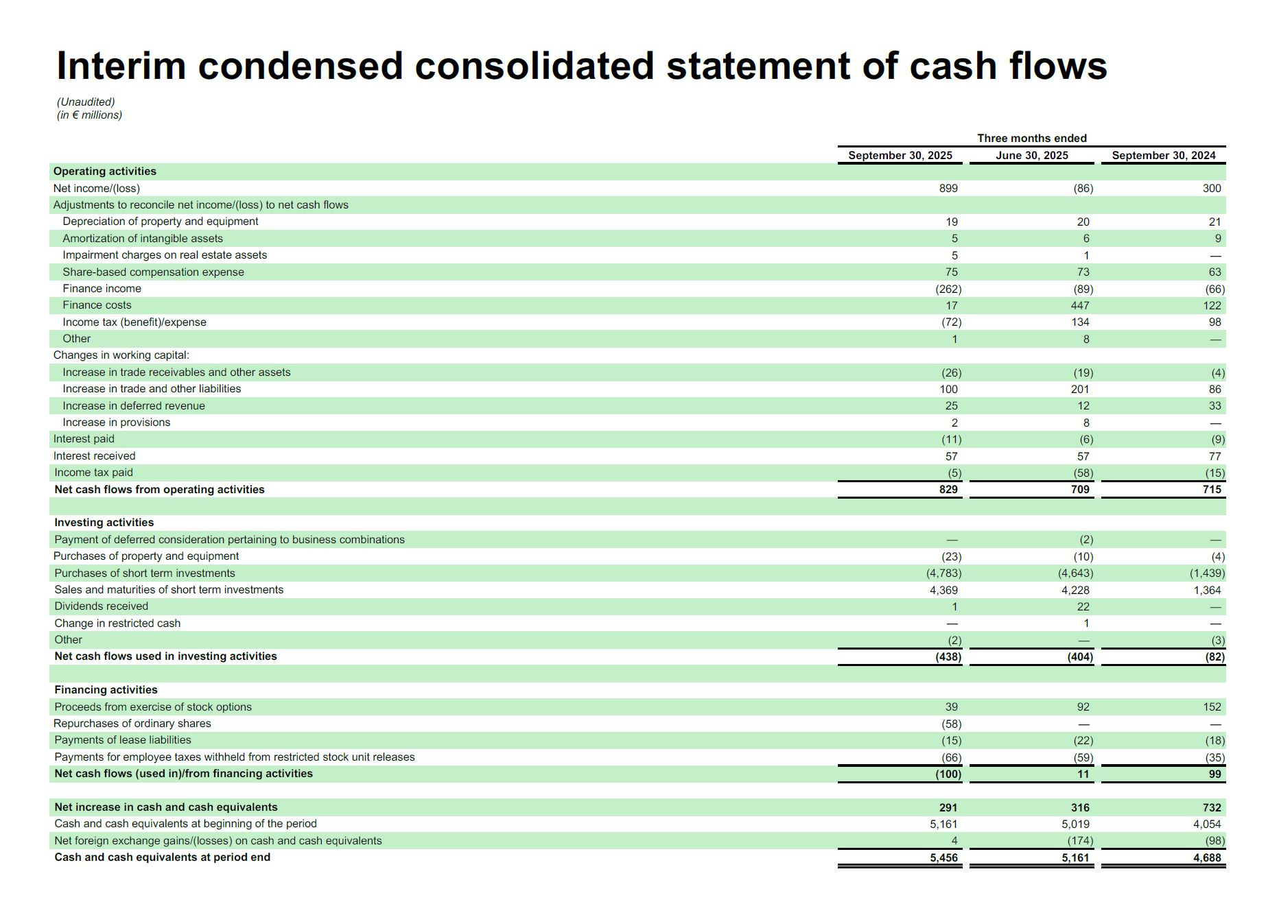 Increase in trade receivables and other assets  (26)  (19)  (4)  Increase in trade and other liabilities  100  201  86  Increase in deferred revenue  25  12  33  Increase in provisions  2  8  —  Interest paid  (11)  (6)  (9)  Interest received  57  57  77  Income tax paid  (5)  (58)  (15)  Net cash flows from operating activities  829  709  715  Investing activities  Payment of deferred consideration pertaining to business combinations  —  (2)  —  Purchases of property and equipment  (23)  (10)  (4)  Purchases of short term investments  (4,783)  (4,643)  (1,439)  Sales and maturities of short term investments  4,369  4,228  1,364  Dividends received  1  22  —  Change in restricted cash  —  1  —  Other  (2)  —  (3)  Net cash flows used in investing activities  (438)  (404)  (82)  Financing activities  Proceeds from exercise of stock options  39  92  152  Repurchases of ordinary shares  (58)  —  —  Payments of lease liabilities  (15)  (22)  (18)  Payments for employee taxes withheld from restricted stock unit releases  (66)  (59)  (35)  Net cash flows (used in)/from financing activities  (100)  11  99  Net increase in cash and cash equivalents  291  316  732  Cash and cash equivalents at beginning of the period  5,161  5,019  4,054  Net foreign exchange gains/(losses) on cash and cash equivalents  4  (174)  (98)  Cash and cash equivalents at period end   5,456   5,161  4,688  September 30, 2024  Operating activities  Net income/(loss) 899 (86) 300  Adjustments to reconcile net income/(loss) to net cash flows  Depreciation of property and equipment 19 20 21  Amortization of intangible assets 5 6 9  Impairment charges on real estate assets 5 1 —  Share-based compensation expense 75 73 63  Finance income (262) (89) (66)  Finance costs 17 447 122  Income tax (benefit)/expense (72) 134 98  Other 1 8 —  Changes in working capital:  (Unaudited) (in € millions)  Three months ended September 30, 2025 June 30, 2025  Interim condensed consolidated statement of cash flows