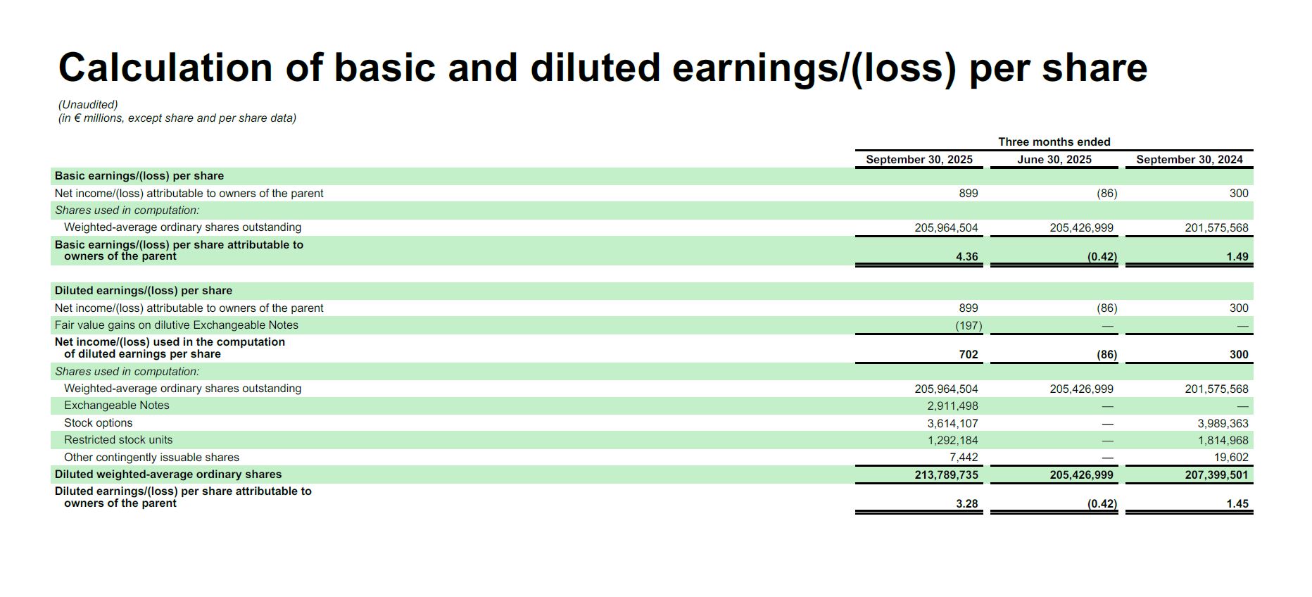 Diluted earnings/(loss) per share  Net income/(loss) attributable to owners of the parent  899  (86)  300  Fair value gains on dilutive Exchangeable Notes  (197)  —  —  Net income/(loss) used in the computation of diluted earnings per share  702  (86)  300  Shares used in computation:  Weighted-average ordinary shares outstanding  205,964,504  205,426,999  201,575,568  Exchangeable Notes  2,911,498  —  —  Stock options  3,614,107  —  3,989,363  Restricted stock units  1,292,184  —  1,814,968  Other contingently issuable shares  7,442  —  19,602  Diluted weighted-average ordinary shares  213,789,735  205,426,999  207,399,501  Diluted earnings/(loss) per share attributable to owners of the parent   3.28   (0.42)  1.45  September 30, 2025  June 30, 2025  September 30, 2024  Basic earnings/(loss) per share  Net income/(loss) attributable to owners of the parent  899  (86)  300  Shares used in computation:  Weighted-average ordinary shares outstanding  205,964,504  205,426,999  201,575,568  Basic earnings/(loss) per share attributable to owners of the parent   4.36   (0.42)   1.49  (Unaudited)  (in € millions, except share and per share data)  Three months ended  Calculation of basic and diluted earnings/(loss) per share