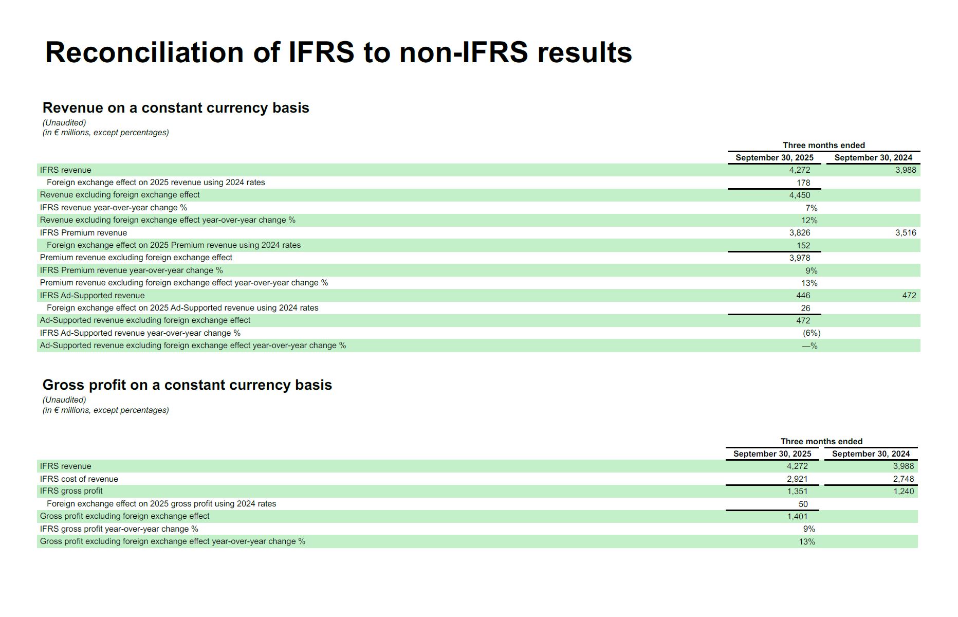 Three months ended  September 30, 2025  September 30, 2024  IFRS revenue  4,272  3,988  Foreign exchange effect on 2025 revenue using 2024 rates  178  Revenue excluding foreign exchange effect  4,450  IFRS revenue year-over-year change %  7%  Revenue excluding foreign exchange effect year-over-year change %  12%  IFRS Premium revenue  3,826  3,516  Foreign exchange effect on 2025 Premium revenue using 2024 rates  152  Premium revenue excluding foreign exchange effect  3,978  IFRS Premium revenue year-over-year change %  9%  Premium revenue excluding foreign exchange effect year-over-year change %  13%  IFRS Ad-Supported revenue  446  472  Foreign exchange effect on 2025 Ad-Supported revenue using 2024 rates  26  Ad-Supported revenue excluding foreign exchange effect  472  IFRS Ad-Supported revenue year-over-year change %  (6%)  Ad-Supported revenue excluding foreign exchange effect year-over-year change %  —%  Revenue on a constant currency basis  (Unaudited)  (in € millions, except percentages)  Reconciliation of IFRS to non-IFRS results  Gross profit on a constant currency basis  (Unaudited)  (in € millions, except percentages)  Three months ended  September 30, 2025  September 30, 2024  IFRS revenue  4,272  3,988  IFRS cost of revenue  2,921  2,748  IFRS gross profit  1,351  1,240  Foreign exchange effect on 2025 gross profit using 2024 rates  50  Gross profit excluding foreign exchange effect  1,401  IFRS gross profit year-over-year change %  9%  Gross profit excluding foreign exchange effect year-over-year change %  13%