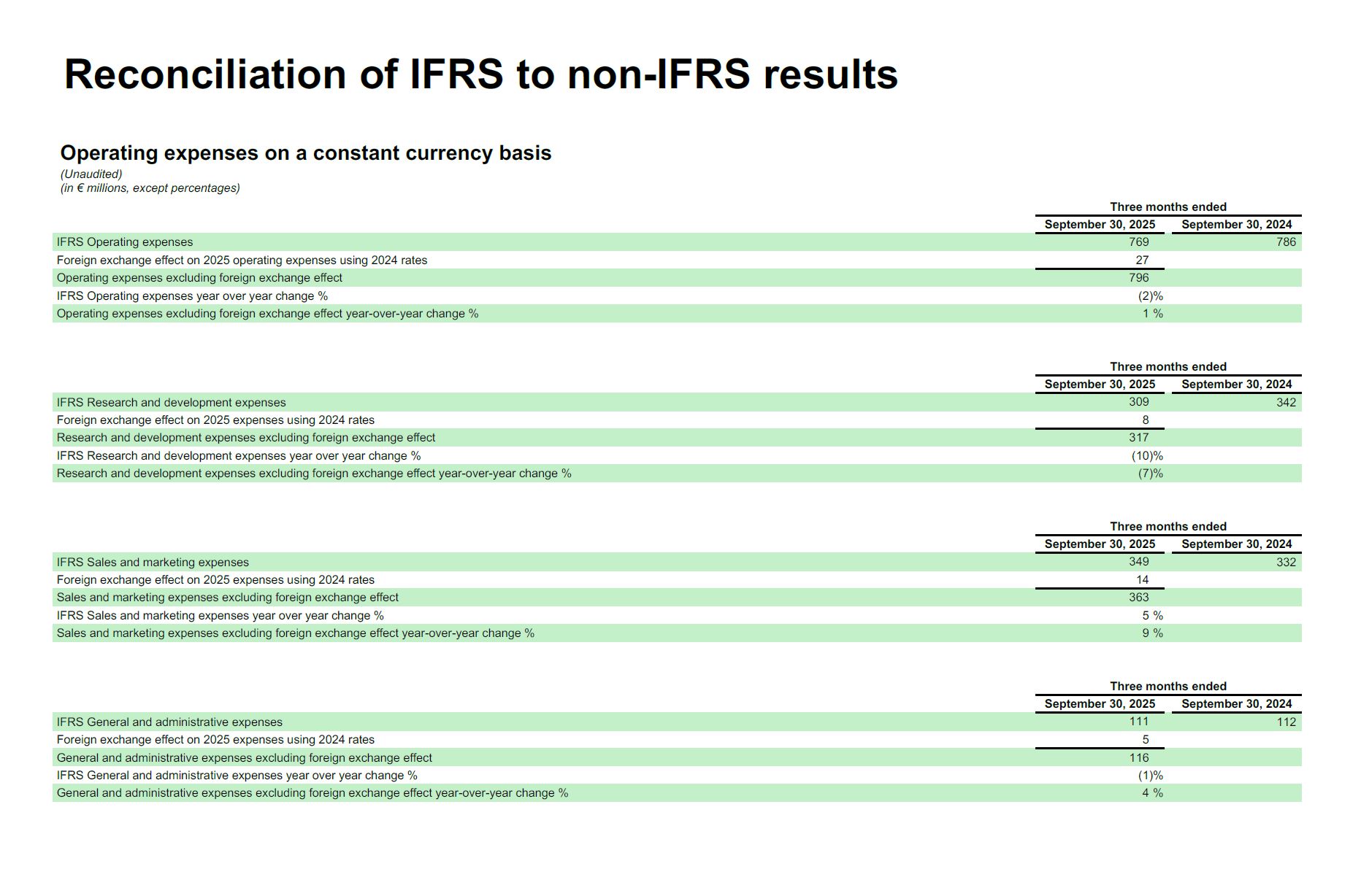 Operating expenses on a constant currency basis  (Unaudited)  (in € millions, except percentages)  Three months ended  September 30, 2025 September 30, 2024  IFRS Research and development expenses  309  342  Foreign exchange effect on 2025 expenses using 2024 rates  8  Research and development expenses excluding foreign exchange effect  317  IFRS Research and development expenses year over year change %  (10)%  Research and development expenses excluding foreign exchange effect year-over-year change %  (7)%  Reconciliation of IFRS to non-IFRS results  Three months ended  September 30, 2025 September 30, 2024  IFRS Sales and marketing expenses  349  332  Foreign exchange effect on 2025 expenses using 2024 rates  14  Sales and marketing expenses excluding foreign exchange effect  363  IFRS Sales and marketing expenses year over year change %  5 %  Sales and marketing expenses excluding foreign exchange effect year-over-year change %  9 %  Three months ended  September 30, 2025 September 30, 2024  IFRS General and administrative expenses  111  112  Foreign exchange effect on 2025 expenses using 2024 rates  5  General and administrative expenses excluding foreign exchange effect  116  IFRS General and administrative expenses year over year change %  (1)%  General and administrative expenses excluding foreign exchange effect year-over-year change %  4 %  Three months ended  September 30, 2025 September 30, 2024  IFRS Operating expenses  769  786  Foreign exchange effect on 2025 operating expenses using 2024 rates  27  Operating expenses excluding foreign exchange effect  796  IFRS Operating expenses year over year change %  (2)%  Operating expenses excluding foreign exchange effect year-over-year change %  1 %