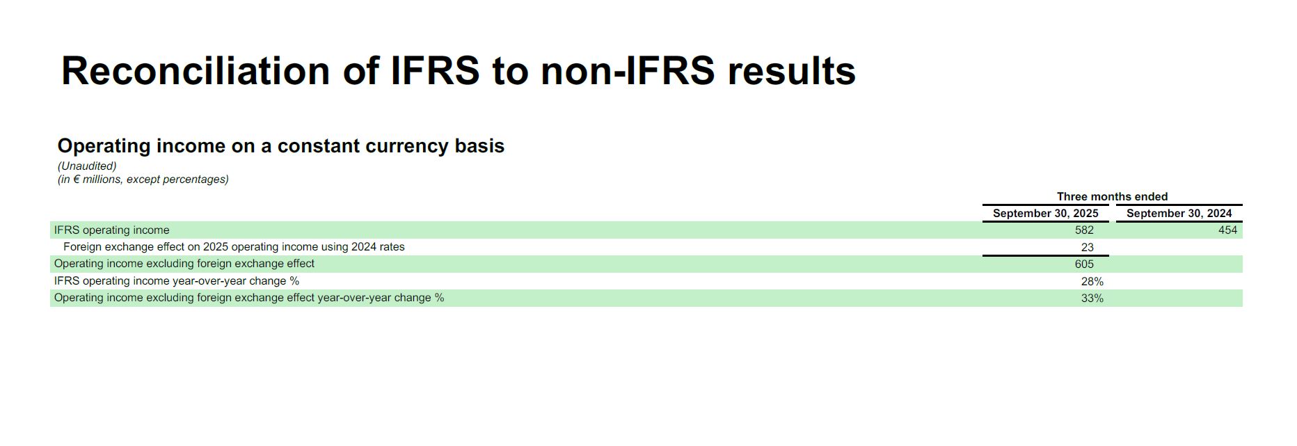 Reconciliation of IFRS to non-IFRS results  Operating income on a constant currency basis  (Unaudited)  (in € millions, except percentages)  Three months ended  September 30, 2025 September 30, 2024  IFRS operating income  582 454  Foreign exchange effect on 2025 operating income using 2024 rates  23  Operating income excluding foreign exchange effect  605  IFRS operating income year-over-year change %  28%  Operating income excluding foreign exchange effect year-over-year change %  33%