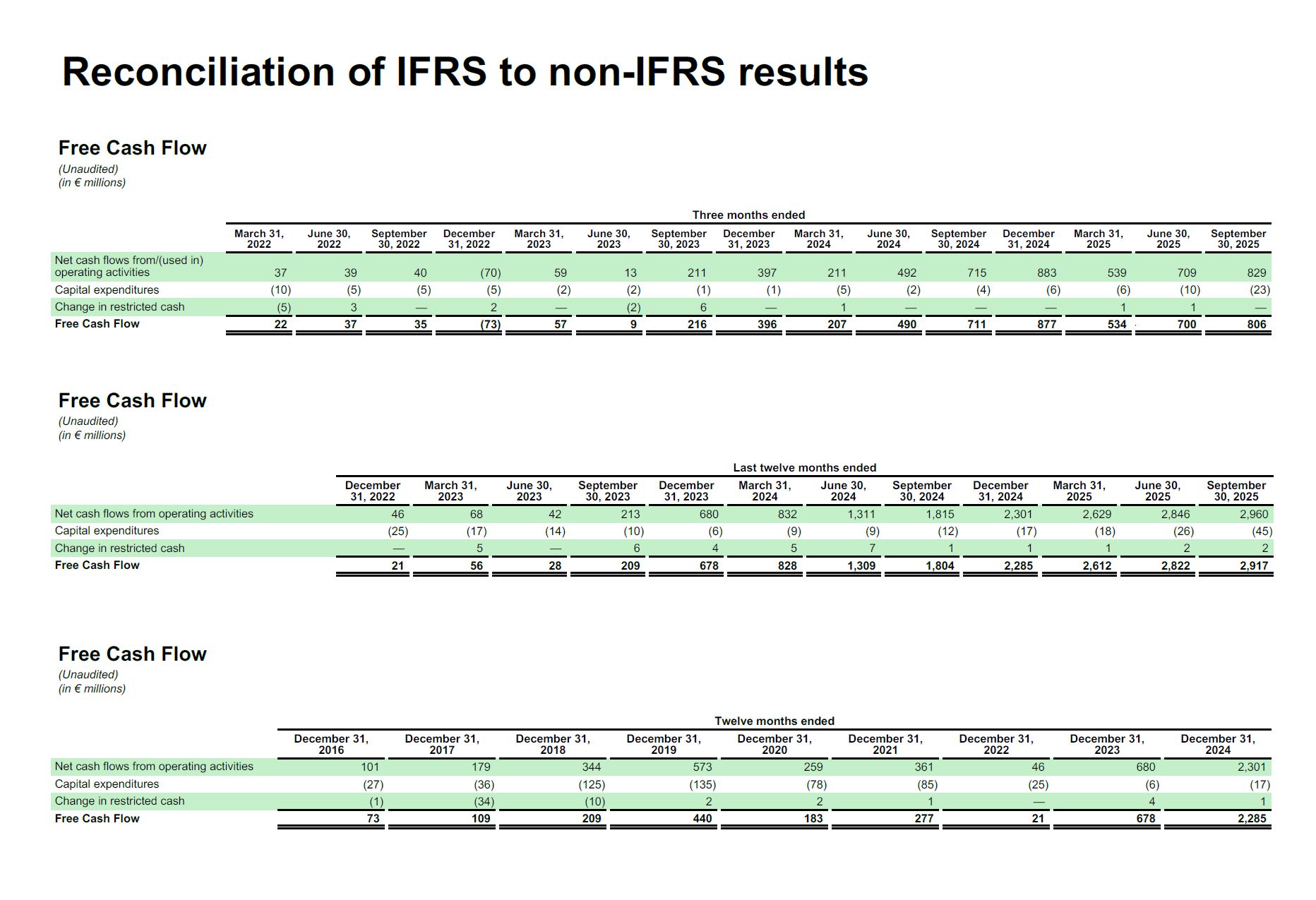 Three months ended  March 31, June 30, September December March 31, June 30, September December March 31, June 30,  2022 2022 30, 2022 31, 2022 2023 2023 30, 2023 31, 2023 2024 2024  September December March 31, June 30, September 30, 2024 31, 2024 2025 2025 30, 2025  Net cash flows from/(used in)  operating activities  37  39  40  (70)  59  13  211  397  211  492  715  883  539  709  829  Capital expenditures  (10)  (5)  (5)  (5)  (2)  (2)  (1)  (1)  (5)  (2)  (4)  (6)  (6)  (10)  (23)  Change in restricted cash  (5)  3  —  2  —  (2)  6  —  1  —  —  —  1  1  —  Free Cash Flow  22  37  35  (73)  57  9  216  396  207  490  711  877  534  700  806  Last twelve months ended  December  March 31,  June 30,  September  December  March 31,  June 30,  September  December  March 31,  June 30,  September  31, 2022  2023  2023  30, 2023  31, 2023  2024  2024  30, 2024  31, 2024  2025  2025  30, 2025  Net cash flows from operating activities  46  68  42  213  680  832  1,311  1,815  2,301  2,629  2,846  2,960  Capital expenditures  (25)  (17)  (14)  (10)  (6)  (9)  (9)  (12)  (17)  (18)  (26)  (45)  Change in restricted cash  —  5  —  6  4  5  7  1  1  1  2  2  Free Cash Flow  21  56  28  209  678  828  1,309  1,804  2,285  2,612  2,822  2,917  Free Cash Flow  (Unaudited) (in € millions)  Reconciliation of IFRS to non-IFRS results  Free Cash Flow  (Unaudited) (in € millions)  Free Cash Flow  (Unaudited)  (in € millions)  Twelve months ended  December 31,  December 31,  December 31,  December 31,  December 31,  December 31,  December 31,  December 31,  December 31,  2016  2017  2018  2019  2020  2021  2022  2023  2024  Net cash flows from operating activities  101  179  344  573  259  361  46  680  2,301  Capital expenditures  (27)  (36)  (125)  (135)  (78)  (85)  (25)  (6)  (17)  Change in restricted cash  (1)  (34)  (10)  2  2  1  —  4  1  Free Cash Flow  73  109  209  440  183  277  21  678  2,285