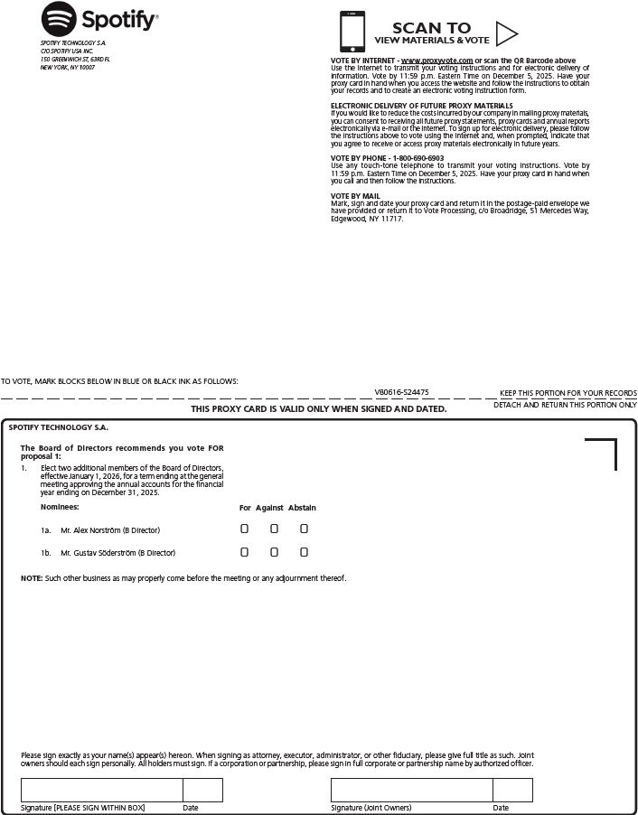 SPOTIFY TECHNOLOGY S.A.C/O SPOTIFY USA INC.150 GREENWICH ST, 63RD FLNEW YORK, NY 10007SCAN TOVIEW MATERIALS & VOTE wVOTE BY INTERNET -www.proxyvote.comor scan the QR Barcode aboveUse the Internet to transmit your voting instructions and for electronic delivery ofinformation. Vote by 11:59 p.m. Eastern Time on December 5, 2025. Have yourproxy card in hand when you access the website and follow the instructions to obtainyour records and to create an electronic voting instruction form.ELECTRONIC DELIVERY OF FUTURE PROXY MATERIALSIf you would like to reduce the costs incurred by our company in mailing proxy materials,you can consent to receiving all future proxy statements, proxy cards and annual reportselectronically via e-mail or the Internet. To sign up for electronic delivery, please followthe instructions above to vote using the Internet and, when prompted, indicate thatyou agree to receive or access proxy materials electronically in future years.VOTE BY PHONE - 1-800-690-6903Use any touch-tone telephone to transmit your voting instructions. Vote by11:59 p.m. Eastern Time on December 5, 2025. Have your proxy card in hand whenyou call and then follow the instructions.VOTE BY MAILMark, sign and date your proxy card and return it in the postage-paid envelope wehave provided or return it to Vote Processing, c/o Broadridge, 51 Mercedes Way,Edgewood, NY 11717. TO VOTE, MARK BLOCKS BELOW IN BLUE OR BLACK INK AS FOLLOWS: V80616-S24475 KEEP THIS PORTION FOR YOUR RECORDS THIS PROXY CARD IS VALID ONLY WHEN SIGNED AND DATED. DETACH AND RETURN THIS PORTION ONLYThe Board of Directors recommends you vote FORproposal 1:1. Elect two additional members of the Board of Directors, effective January 1, 2026, for a term ending at the generalmeeting approving the annual accounts for the financialyear ending on December 31, 2025.1a. Mr. Alex Norström (B Director)1b. Mr. Gustav Söderström (B Director)Nominees:SPOTIFY TECHNOLOGY S.A.NOTE: Such other business as may properly come before the meeting or any adjournment thereof. For Against Abstain Please sign exactly as your name(s) appear(s) hereon. When signing as attorney, executor, administrator, or other fiduciary, please give full title as such. Jointowners should each sign personally. All holders must sign. If a corporation or partnership, please sign in full corporate or partnership name by authorized officer. Signature [PLEASE SIGN WITHIN BOX] Date Signature (Joint Owners) Date