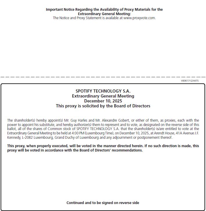 V80617-S24475Important Notice Regarding the Availability of Proxy Materials for theExtraordinary General Meeting:The Notice and Proxy Statement is available at www.proxyvote.com.SPOTIFY TECHNOLOGY S.A.Extraordinary General MeetingDecember 10, 2025This proxy is solicited by the Board of DirectorsThe shareholder(s) hereby appoint(s) Mr. Guy Harles and Mr. Alexandre Gobert, or either of them, as proxies, each with the power to appoint his substitute, and hereby authorize(s) them to represent and to vote, as designated on the reverse side of this ballot, all of the shares of Common stock of SPOTIFY TECHNOLOGY S.A. that the shareholder(s) is/are entitled to vote at the Extraordinary General Meeting to be held at 4:00 PM (Luxembourg Time), on December 10, 2025, at Arendt House, 41A Avenue J.F.Kennedy, L-2082 Luxembourg, Grand Duchy of Luxembourg and any adjournment or postponement thereof.This proxy, when properly executed, will be voted in the manner directed herein. If no such direction is made, this proxy will be voted in accordance with the Board of Directors' recommendations.Continued and to be signed on reverse side