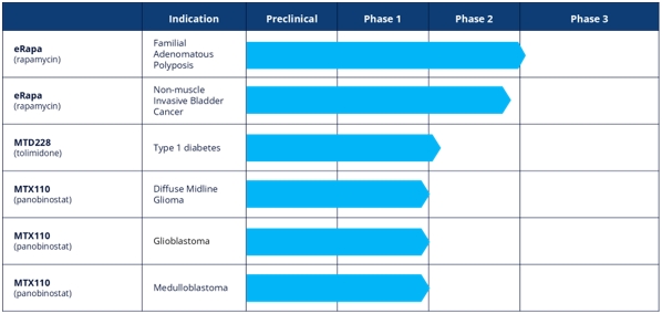 MTX110 is a solubilised formulation of the histone deacetylase (HDAC) inhibitor, panobinostat. This proprietary formulation enables delivery of the product via convection-enhanced delivery (CED) at chemotherapeutic doses directly to the site of the tumor, by-passing the blood-brain barrier and potentially avoiding systemic toxicity.