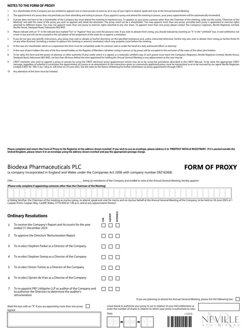 If you are planning to attend the Annual General Meeting, please tick the following box:Ñ>123|Ó>123-0Ordinary ResolutionsFORM OF PROXYBiodexa Pharmaceuticals PLC(a company incorporated in England and Wales under the Companies Act 2006 with company number 09216368)I?We _________________________________________________ being (a) member(s) of the Company and entitled to vote at the AnnualGeneral Meeting, hereby appoint(Please only complete if appointing someone other than the Chairman of the Meeting)or failing him?her, the Chairman of the meeting as my?our proxy, to attend, speak and vote for me?us and on my?our behalf atthe Annual General Meeting of the Company, to be held on 26 June 2025 at 1Caspian Point, Caspian Way, Cardiff, Wales, CF10 4DQ at 1:00 p.m. and at any adjournment thereof.Leave blank to authorise your proxy to act in relation to your full entitlement or enter the number of shares in relation to which your proxy is authorised to vote:DDMMYYMark this box with an "X" if you are appointing more than one proxy:Date:Signed:1To receive the Company?s Report and Accounts for the year ended 31 December 20242To approve the Directors? Remuneration Report3To re-elect Stephen Parker as a Director of the Company4To re-elect Stephen Stamp as a Director of the Company5To re-elect Simon Turton as a Director of the Company6To re-elect Sijmen de Vries as a Director of the Company7To re-appoint PKF Littlejohn LLP as auditor of the Company and to authorise the Directors to determine the auditor's remunerationFORAGAINSTWITHHELD1As a shareholder of the Company you are entitled to appoint one or more proxies to exercise all or any of your rights to attend, speak and vote at the Annual General Meeting.2The appointment of a proxy does not preclude you from attending and voting in person. If you appoint a proxy and attend the meeting in person, yourproxy appointment will be automatically terminated.3A proxy does not have to be a shareholder of the Company but must attend the meeting to representyou. To appoint as your proxy a person other thanthe Chairman of the meeting, strike out the words"Chairman of the Meeting" and add the name of the proxy you wish to appoint and initial the alteration. The proxy need not be a shareholder. You may appoint more than one proxy, provided each proxy is appointed to exercise rights attached to different shares. You may not appoint more than one proxy to exercise rights attached toany one share. To appoint more than one proxy please contact the Company'sregistrars, Neville Registrars Limited, Neville House, Steelpark Road, Halesowen B62 8HD.4Please indicate with an "X" in the relevant box marked "For" or "Against" how you wish the proxy to vote. If you wish to abstain from voting, you should indicate by inserting an "X" in the "withheld" box. A vote withheld is not a vote in law and will not be counted in the calculation of the proportion of the votes for or against a resolution.5If you do not give any specific instructions, your proxy may vote or abstain at his?her discretion on the specified resolutions and, unless instructed otherwise, he?she mayalso vote or abstain from voting as he?she thinksfit on any other business (including a motion to adjourn the meeting or amend a resolution) which may properly come before the meeting.6In the case of a shareholder which is a corporation this form must be completed under its common seal or under the hand ofa duly authorised officer or attorney.7In the case of joint holders the vote of the first-named holder on the Register of Members (whether voting in person or byproxy) will be accepted to the exclusion of the votes of the other joint holders.8To be valid, this form and the power of attorney or other authority (if any) under which it is signed, or a notarially certified copy of such powermust reach the Company'sRegistrars, Neville Registrars Limited, Neville House, Steelpark Road, Halesowen B62 8HD, not less than 48 hours before the time appointed for holding the Annual General Meeting orany adjournment as the case may be.9CREST members who wish to appoint a proxy or proxies by using the CREST electronic proxy appointment service may do so by using the procedures described in the CREST Manual. To be valid, the appropriate CREST message, regardless of whether it constitutes the appointment of a proxy or an amendment to the instructions given to a previously appointed proxy, must be transmitted so as to be received by our agent Neville Registrars Limited (CREST ID: 7RA11) by 1:00 p.m. (UK time) on 24 June 2025. See the notes to the Notice of Meeting for further information on proxy appointment through CREST.10Any alteration of this form must be initialed.NOTES TO THE FORM OF PROXYPlease complete and return this Form of Proxy to the Registrar at the address shown overleaf. If you wish to use an envelope, please address it to 'FREEPOST NEVILLE REGISTRARS'. If it is posted outside the United Kingdom, please return it in an envelope using the address shown overleaf and pay the appropriate postage charge.