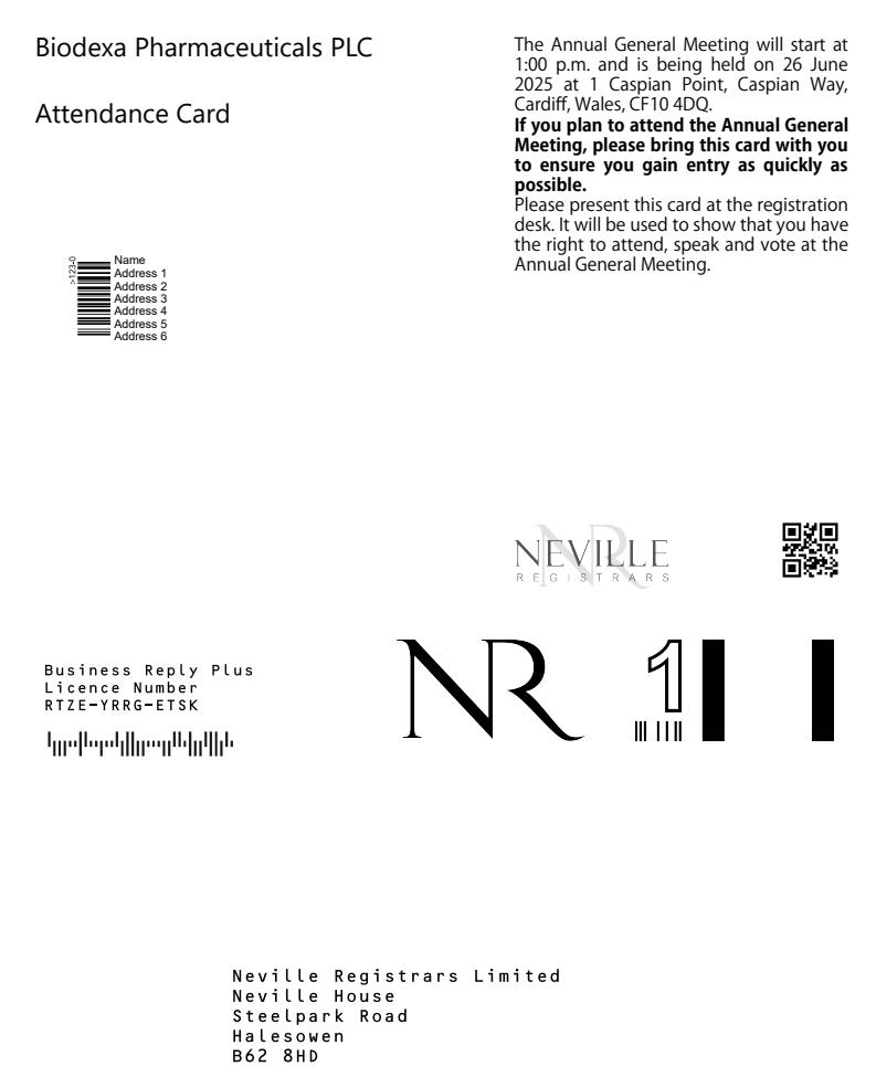 Ñ>123|ÓBiodexa Pharmaceuticals PLCAttendance CardThe Annual General Meeting will start at 1:00 p.m. and is being held on 26 June 2025 at 1 Caspian Point, Caspian Way, Cardiff, Wales, CF10 4DQ.If you plan to attend the Annual General Meeting, please bring this card with you to ensure you gain entry as quickly as possible.Please present this card at the registration desk. It will be used to show that you have the right to attend, speak and vote at the Annual General Meeting.NameAddress 1Address 2Address 3Address 4Address 5Address 6