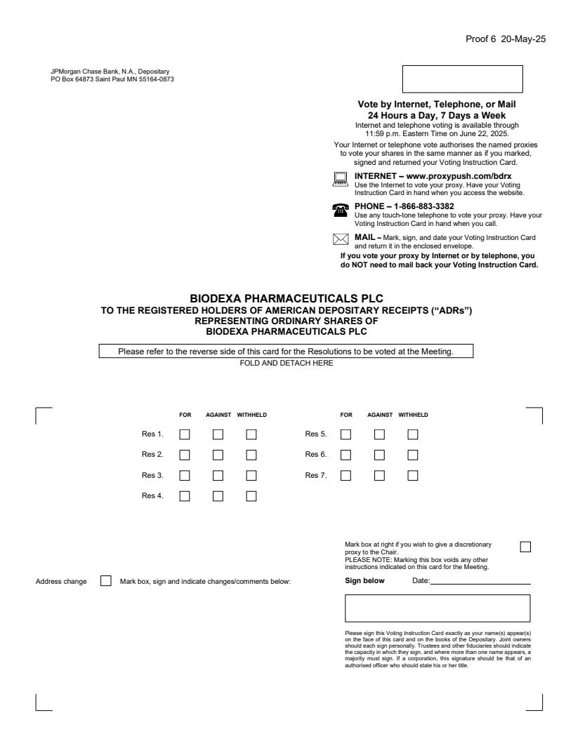 Proof 6 20-May-25 FOR AGAINST WITHHELD FOR AGAINST WITHHELD Res 1. Res 5. Res 2. Res 6. Res 3. Res 7. Res 4. BIODEXA PHARMACEUTICALS PLC TO THE REGISTERED HOLDERS OF AMERICAN DEPOSITARY RECEIPTS ("ADRs") REPRESENTING ORDINARY SHARES OF BIODEXA PHARMACEUTICALS PLC Sign below Date: Please sign this Voting Instruction Card exactly as your name(s) appear(s) on the face of this card and on the books of the Depositary. Joint owners should each sign personally. Trustees and other fiduciaries should indicate the capacity in which they sign, and where more than one name appears, a majority must sign. If a corporation, this signature should be that of an authorised officer who should state his or her title. FOLD AND DETACH HERE Please refer to the reverse side of this card for the Resolutions to be voted at the Meeting. Address change Mark box, sign and indicate changes/comments below: Mark box at right if you wish to give a discretionary proxy to the Chair. PLEASE NOTE: Marking this box voids any other instructions indicated on this card for the Meeting. JPMorgan Chase Bank, N.A., Depositary PO Box 64873 Saint Paul MN 55164-0873 Vote by Internet, Telephone, or Mail 24 Hours a Day, 7 Days a Week Internet and telephone voting is available through 11:59 p.m. Eastern Time on June 22, 2025. Your Internet or telephone vote authorises the named proxies to vote your shares in the same manner as if you marked, signed and returned your Voting Instruction Card. INTERNET ? www.proxypush.com/bdrx Use the Internet to vote your proxy. Have your Voting Instruction Card in hand when you access the website. PHONE ? 1-866-883-3382 Use any touch-tone telephone to vote your proxy. Have your Voting Instruction Card in hand when you call. MAIL ? Mark, sign, and date your Voting Instruction Card and return it in the enclosed envelope. If you vote your proxy by Internet or by telephone, you do NOT need to mail back your Voting Instruction Card.