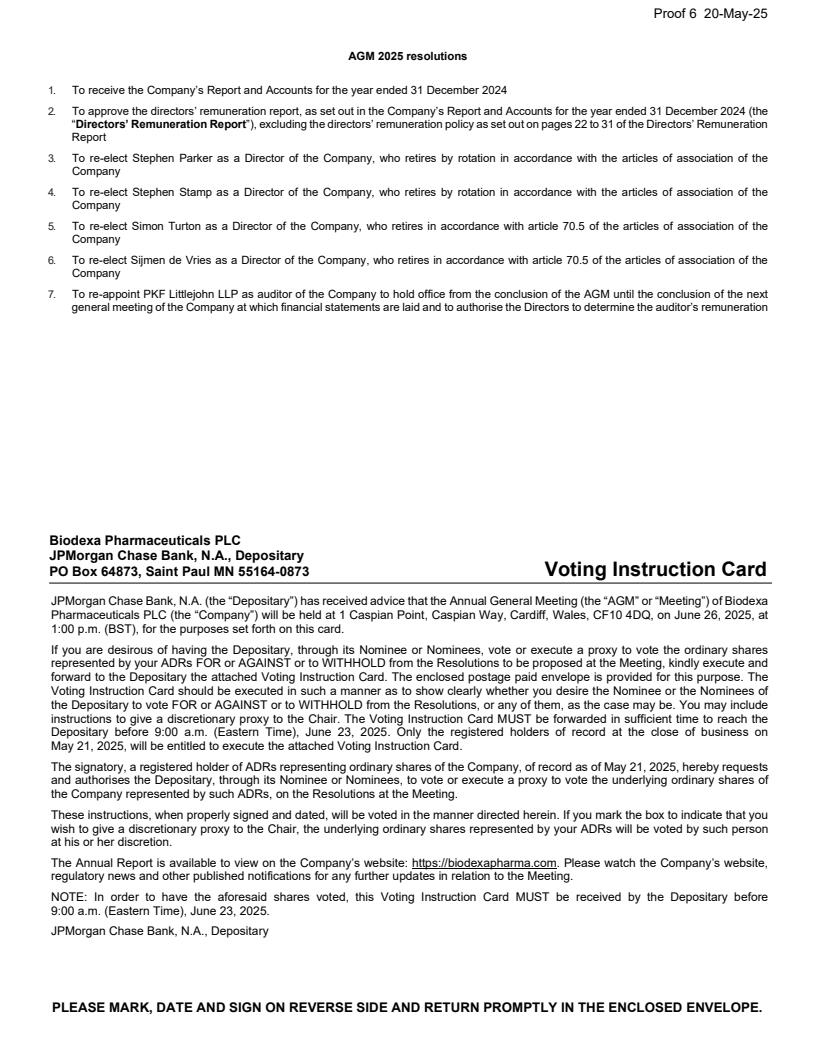 Proof 6 20-May-25 AGM 2025 resolutions 1. To receive the Company's Report and Accounts for the year ended 31 December 2024 2. To approve the directors' remuneration report, as set out in the Company's Report and Accounts for the year ended 31 December 2024 (the "Directors' Remuneration Report"), excluding the directors' remuneration policy as set out on pages 22 to 31 of the Directors' Remuneration Report 3. To re-elect Stephen Parker as a Director of the Company, who retires by rotation in accordance with the articles of association of the Company 4. To re-elect Stephen Stamp as a Director of the Company, who retires by rotation in accordance with the articles of association of the Company 5. To re-elect Simon Turton as a Director of the Company, who retires in accordance with article 70.5 of the articles of association of the Company 6. To re-elect Sijmen de Vries as a Director of the Company, who retires in accordance with article 70.5 of the articles of association of the Company 7. To re-appoint PKF Littlejohn LLP as auditor of the Company to hold office from the conclusion of the AGM until the conclusion of the next general meeting of the Company at which financial statements are laid and to authorise the Directors to determine the auditor's remuneration Biodexa Pharmaceuticals PLC JPMorgan Chase Bank, N.A., Depositary PO Box 64873, Saint Paul MN 55164-0873 Voting Instruction Card PLEASE MARK, DATE AND SIGN ON REVERSE SIDE AND RETURN PROMPTLY IN THE ENCLOSED ENVELOPE. JPMorgan Chase Bank, N.A. (the "Depositary") has received advice that the Annual General Meeting (the "AGM" or "Meeting") of Biodexa Pharmaceuticals PLC (the "Company") will be held at 1 Caspian Point, Caspian Way, Cardiff, Wales, CF10 4DQ, on June 26, 2025, at 1:00 p.m. (BST), for the purposes set forth on this card. If you are desirous of having the Depositary, through its Nominee or Nominees, vote or execute a proxy to vote the ordinary shares represented by your ADRs FOR or AGAINST or to WITHHOLD from the Resolutions to be proposed at the Meeting, kindly execute and forward to the Depositary the attached Voting Instruction Card. The enclosed postage paid envelope is provided for this purpose. The Voting Instruction Card should be executed in such a manner as to show clearly whether you desire the Nominee or the Nominees of the Depositary to vote FOR or AGAINST or to WITHHOLD from the Resolutions, or any of them, as the case may be. You may include instructions to give a discretionary proxy to the Chair. The Voting Instruction Card MUST be forwarded in sufficient time to reach the Depositary before 9:00 a.m. (Eastern Time), June 23, 2025. Only the registered holders of record at the close of business on May 21, 2025, will be entitled to execute the attached Voting Instruction Card. The signatory, a registered holder of ADRs representing ordinary shares of the Company, of record as of May 21, 2025, hereby requests and authorises the Depositary, through its Nominee or Nominees, to vote or execute a proxy to vote the underlying ordinary shares of the Company represented by such ADRs, on the Resolutions at the Meeting. These instructions, when properly signed and dated, will be voted in the manner directed herein. If you mark the box to indicate that you wish to give a discretionary proxy to the Chair, the underlying ordinary shares represented by your ADRs will be voted by such person at his or her discretion. The Annual Report is available to view on the Company's website: https://biodexapharma.com. Please watch the Company's website, regulatory news and other published notifications for any further updates in relation to the Meeting. NOTE: In order to have the aforesaid shares voted, this Voting Instruction Card MUST be received by the Depositary before 9:00 a.m. (Eastern Time), June 23, 2025. JPMorgan Chase Bank, N.A., Depositary