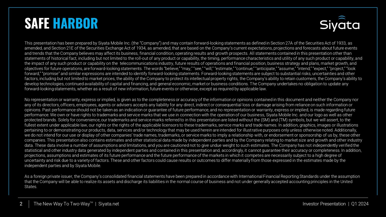 SAFE HARBOR This presentation has been prepared by Siyata Mobile Inc. (the “Company”) and may contain forward - looking statements as defined in Section 27A of the Securities Act of 1933, as amended, and Section 21E of the Securities Exchange Act of 1934, as amended, that are based on the Company’s current expectat ion s, projections and forecasts about future events and trends that the Company believes may affect its business, financial condition, operating results and growth prospects. Al l s tatements contained in this presentation other than statements of historical fact, including but not limited to the roll - out of any product or capability, the timing, performance c haracteristics and utility of any such product or capability, and the impact of any such product or capability on the telecommunications industry, future results of operations and financial pos ition, business strategy and plans, market growth, and objectives for future operations, are forward - looking statements. The words “believe,” “may,” “see,” “will,” “estimate,” “contin ue,” “anticipate,” “assume,” “intend,” “expect,” “project,” “look forward,” “promise” and similar expressions are intended to identify forward - looking statements. Forward - looking statements are subject to substantial risks, uncertainties and other factors, including but not limited to market prices, the ability of the Company to protect its intellectual property rights, the Company’s ability to retain customers, the Company’s ability to develop technologies, continued availability of capital and financing, and general economic, market or business conditions. T he Company undertakes no obligation to update any forward - looking statements, whether as a result of new information, future events or otherwise, except as required by applicable law. No representation or warranty, express or implied, is given as to the completeness or accuracy of the information or opinions co ntained in this document and neither the Company nor any of its directors, officers, employees, agents or advisers accepts any liability for any direct, indirect or consequential lo ss or damage arising from reliance on such information or opinions. Past performance should not be taken as an indication or guarantee of future performance, and no representation or war ranty, express or implied, is made regarding future performance. We own or have rights to trademarks and service marks that we use in connection with the operation of our busine ss, Siyata Mobile Inc. and our logo as well as other protected brands. Solely for convenience, our trademarks and service marks referred to in this presentation are listed withou t t he (SM) and (TM) symbols, but we will assert, to the fullest extent under applicable law, our rights or the rights of the applicable licensors to these trademarks, service marks and trade names. In addition, graphics, images or illustrations pertaining to or demonstrating our products, data, services and/or technology that may be used herein are intended for illust rat ive purposes only unless otherwise noted. Additionally, we do not intend for our use or display of other companies’ trade names, trademarks, or service marks to imply a relationship wi th, or endorsement or sponsorship of us by, these other companies. This presentation also contains estimates and other statistical data made by independent parties and by the Compan y r elating to market size and growth and other industry data. These data involve a number of assumptions and limitations, and you are cautioned not to give undue weight to such esti mat es. The Company has not independently verified the statistical and other industry data generated by independent parties and contained in this presentation and, accordingly, it can not guarantee their accuracy or completeness. In addition, projections, assumptions and estimates of its future performance and the future performance of the markets in which it compet es are necessarily subject to a high degree of uncertainty and risk due to a variety of factors. These and other factors could cause results or outcomes to differ materiall y f rom those expressed in the estimates made by the independent parties and by Siyata Mobile. As a foreign private issuer, the Company’s consolidated financial statements have been prepared in accordance with Internatio nal Financial Reporting Standards under the assumption that the Company will be able to realize its assets and discharge its liabilities in the normal course of business and not un der generally accepted accounting principles in the United States. 2 Investor Presentation | Q1 2024 The New Way To Two - Way TM | Siyata.net