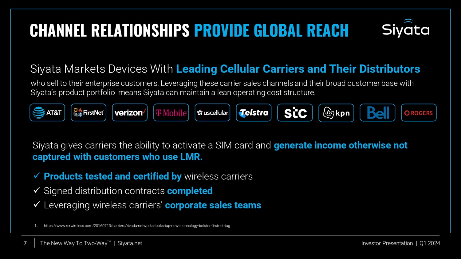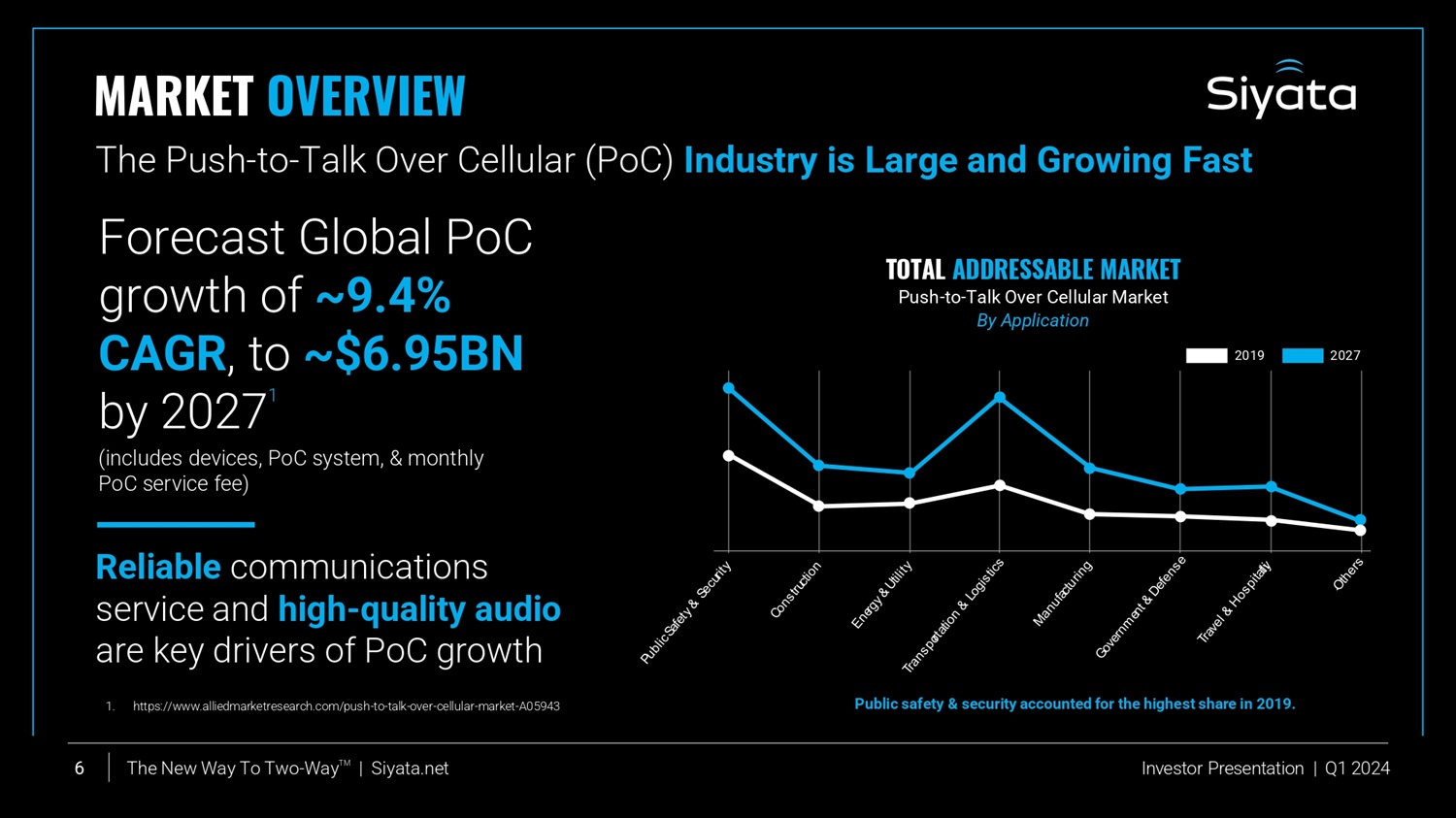 PUSH - TO - TALK OVER CELLULAR (POC) EVOLUTION 5 Limited Range City - wide coverage only with dead zones; No nationwide coverage Restricted Functionality Limited to voice & low - capacity data High Cost Very expensive LMR devices, tower sites and maintenance Problems With Land Mobile Radio (LMR) or Two - way radios 1,2 Range PTT handsets work virtually anywhere on cellular networks Functionality Supports PTT, and other data applications Low Cost Much lower cost PTT Handsets, and no customer investment in tower sites • PoC Total Cost of Ownership (TCO) gives savings of at least 70% compared to LMR TCO 5 Push - to - Talk over Cellular Delivers Next Gen Communication Technology 3,4 1. https://blog.peakptt.com/drawbacks - of - traditional - land - mobile - radio - systems/ 2. https://www.taitradioacademy.com/topic/pros - and - cons - of - land - mobile - radio - lmr/ 3. https://www.firstnet.gov/network 4. A Brief Look at the Development of Push - To - Talk Technology Through the Ages, Motorola Solutions White Paper 5. Assumes 400 users over 5 - year timeline, compared to operating $2 million P25 LMR network Investor Presentation | Q1 2024 The New Way To Two - Way TM | Siyata.net